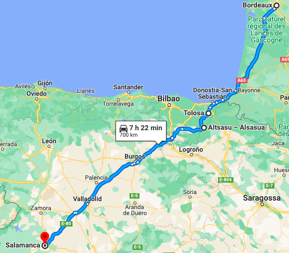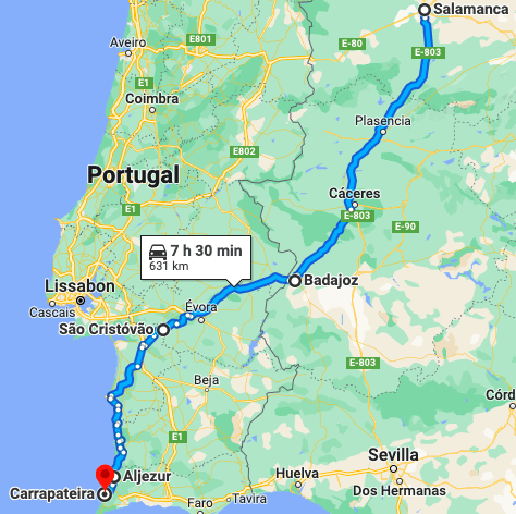 Erleichtert und beschwingt bezahle ich mein Frühstück und fahre zurück Richtung Autobahn, nehme jedoch nicht die Auffahrt, sondern überquere die Autobahn auf der Nationalstraße und fahre geradeaus in die Berge. Was sich allerdings nicht als gute Idee erweist, schon nach wenigen Minuten stehe ich im Stau einer Baustelle. Hinter der abwechselnd für den Verkehr bergab und bergauf freigegebenen Engstelle führt mich eine neue breite Nationalstraße über Tolosa auf den westlichsten Pyrennäenpass und hinab ins Navarra, im Tal biege ich nach rechts Richtung Vitoria ab, wo ich wieder auf meiner Hauptstrecke , der N1 Richtung Südwesten bin, hinter Vitoria entscheide ich mich für die langsamere, aber unterhaltsamere Nationalstraße, statt der mautpflichtigen, langweiligen Autobahn. Am frühen Abend bin ich in Valladolid und biege auf die E80 Richtung Portugal ab. Vor Salamanca geht rechts von mir spektakulär die Sonne hinter den Hügel Westspaniens unter.