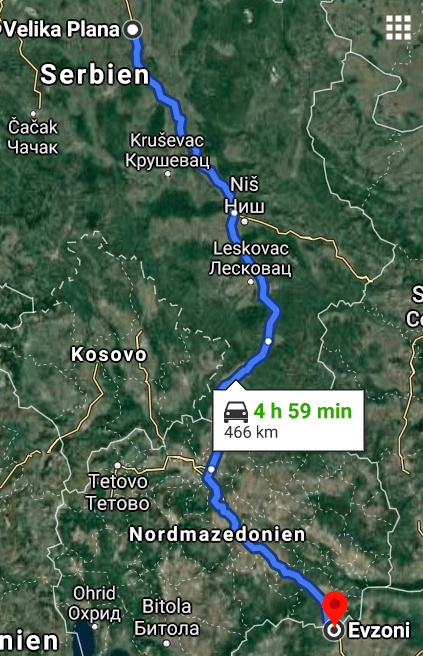 Am nächsten Morgen tat mein Nacken immer noch weh, aber immerhin hatte ich geschlafen. Während wir unsere Sachen aufpackten, erschien ein Roma-Mädchen und wollte eine Zigarette schnorren, kurz darauf eine ganze Fußballmannschaft von Roma-Teenagern. Schnell waren Wowas und Toms Marlboros zu Ende, ich hatte nur Samson-Tabak, den sie verschmähten. Die Roma zogen weiter, Wowa und Tom führten mich im Ortszentrum durch schmale Gassen zum Hintereingang eines Restaurants, Wowa kloppfte laut gegen die Tür, eine alte Dame erschien, die Wowa offenbar wiedererkannte und sich überzeugen ließ, uns ein ›serbisches Frühstück‹ zuzubereiten. Die Mengen an Grillfleisch mit scharfer Tomatensoße und Reis hätten für ein gutes deutsches Abendessen ausgereicht. Am Nachmittag erreichten wir Niš. Vor dem Abzweig nach Sofia stoppten wir auf einem Parkplatz, Wowa und Tom versuchten nochmals, mich zu dem kürzeren Weg durch Bulgarien zu überreden, bestanden aber jedenfalls darauf, dass wir uns in spätestens vier Tagen in Assos treffen müssten.