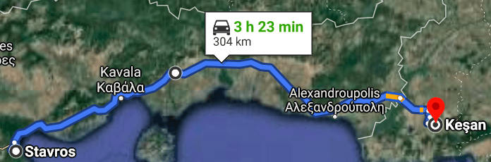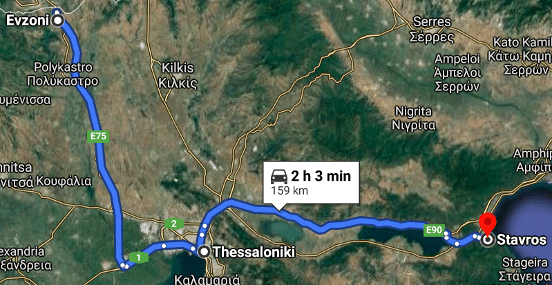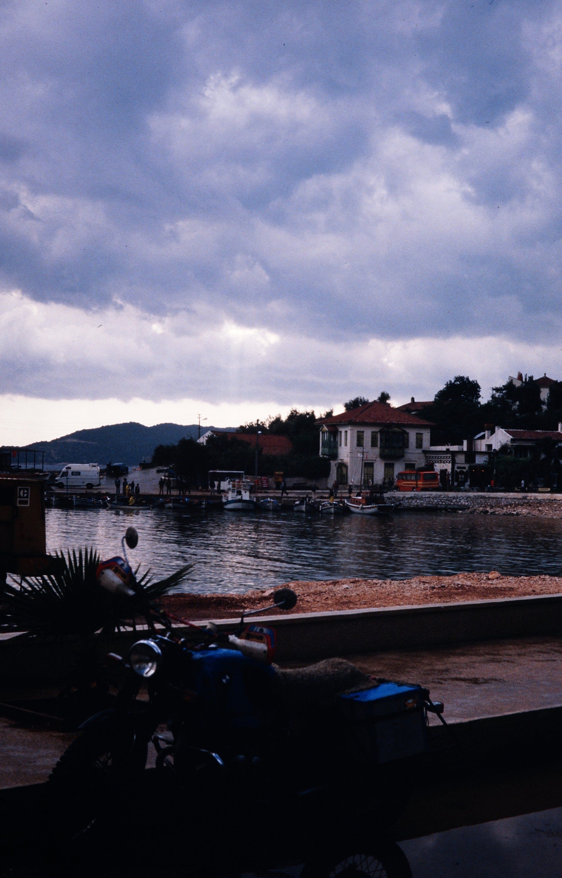 Nachmittags war ich wieder auf dem Weg Richtung Osten, in den Außenbezirken von Thessaloniki stoppte ich kurz an einer Kreuzung, um die Karte auf die richtige Seite umzudrehen, nach weniger als einer Minute hielt ein griechischer Motorradpolizist neben mir, fragte, wo ich hinwollte und bestand darauf, bis zum Ortsausgang vor mir her zu fahren. Zwei Stunden später gab die Landstraße den Blick auf das Meer frei und in einer kleinen Hafenstadt mit dem höchst griechischen Namen Stavros fand ich ein sehr billiges Hotel. Abends nach der täglichen kleinen Motorradwartung (Öl-, Reifen-, Felgenkontrolle) aß ich am Hafen gegrillten Fisch, heute war der erste einigermaßen warme Tag der Reise. Die ganze Stadt schien in Festtagslaune zu sein.
