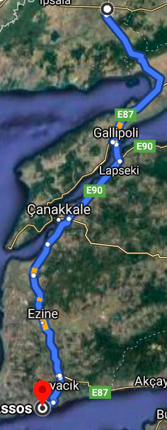 Am Ortsausgang tanke ich zum ersten Mal in der Türkei. Selbstbedienung ist streng verboten, oder jedenfalls nicht erwünscht, wenn ich den aufgeregt heranlaufenden Tankwart richtig verstehe. Ich begnüge mich damit, den Tankrucksack wegzuklappen und freue mich an den erstaunten Ausrufen des Tankwarts, als der Tank nach 30 Litern noch lange nicht voll ist. ›Hamdulillah‹ hätte Hadschi Halef Omar wohl gerufen. Der Tankwart sagt vermutlich etwas ähnliches, das ich aber nicht verstehe. Am Ende habe ich jedenfalls wieder Benzin für einige Hundert Kilometer und meine Geldbörse ist nur wenig dünner geworden. Obwohl der Betrag in türkischen Lira erschreckend hoch ist, habe ich umgerechnet nicht mehr bezahlt als beim Volltanken des originalen 22-Liter-Tanks in Deutschland. Und doch war das wahrscheinlich das teuerste Benzin der nächsten drei oder vier Monate. Die nächsten Kilometer auf der Landstraße verbringe ich damit, den Motorlauf zu beobachten und den Benzinverbrauch der letzten Tage im Kopf auszurechnen, bleibe in meinen Berechnungen aber schon bald stecken als das Meer wieder in Sicht kommt. Das Weiße Meer, wie das Mittelmeer im Gegensatz zum Schwarzen in der Türkei genannt wird, macht seinem Namen heute wirklich alle Ehre. Gefühlt kann man von hier bis Athen gucken, tatsächlich natürlich nicht. Und so bin ich etwas traurig als die Straße sich von der Küste abwendet und nach Südsüdost in's Landesinnere abbiegt. Statt Mittelmeer liegt rechts von mir jetzt das antike Troja, Ausgrabungsstätten sind aber nicht mein Hauptanliegen bei dieser Reise. Bei der Vorbereitung der Reise tauchten immer wieder große Namen antiker Hochkulturen auf. Dass ich jetzt auf dem Weg ins antike Assos bin, liegt nur an Wowa und Tom nicht an Aristoteles oder Alexander dem Großen. Kaum eine Stunde später passiere ich das Ortsschild von Ayvaçik. Wowa hatte mir eine genaue Wegbeschreibung mitgegeben. Die Fernstraße beschreibt in Höhe der Ortsmitte eine langgezogene Linkskurve, hier muss ich halbrechts auf die Landstraße Richtung Behramkale abbiegen und dieser folgen. Nach zwanzig Minuten auf der einspurigen Landstraße kommen links die ersten Häuser des heutigen Dorfes Behramkale in Sicht. Die Straße führt zwischen den Häusern des Dorfes und den Grabungsstätten des antiken Assos hindurch. Schließlich weist an einer Kreuzung ein Schild nach links Richtung ›Liman‹, dem Hafen des antiken Assos und des modernen Behramkale. Zwei weitläufige Kehren führen hinab zum Meer.