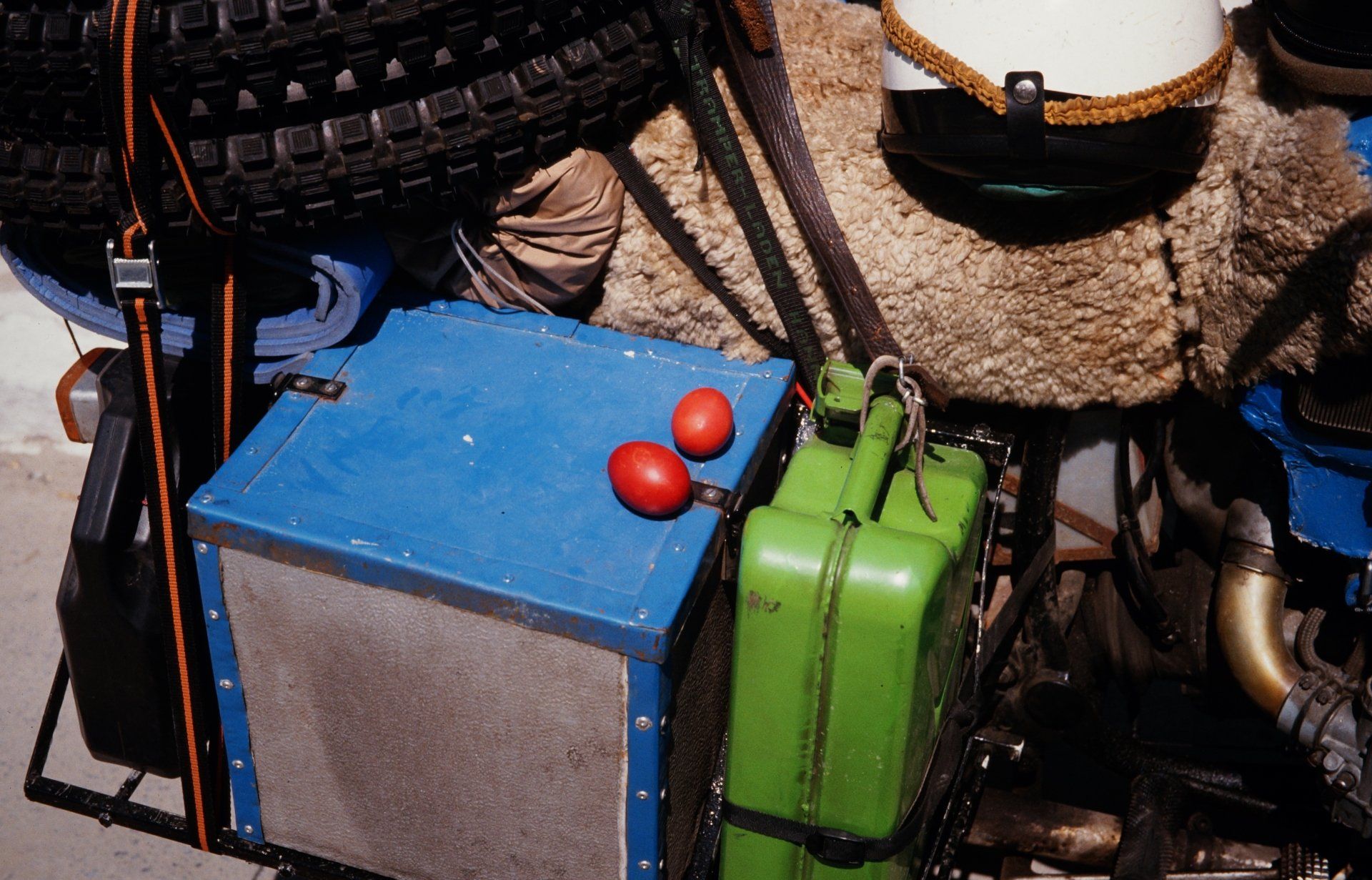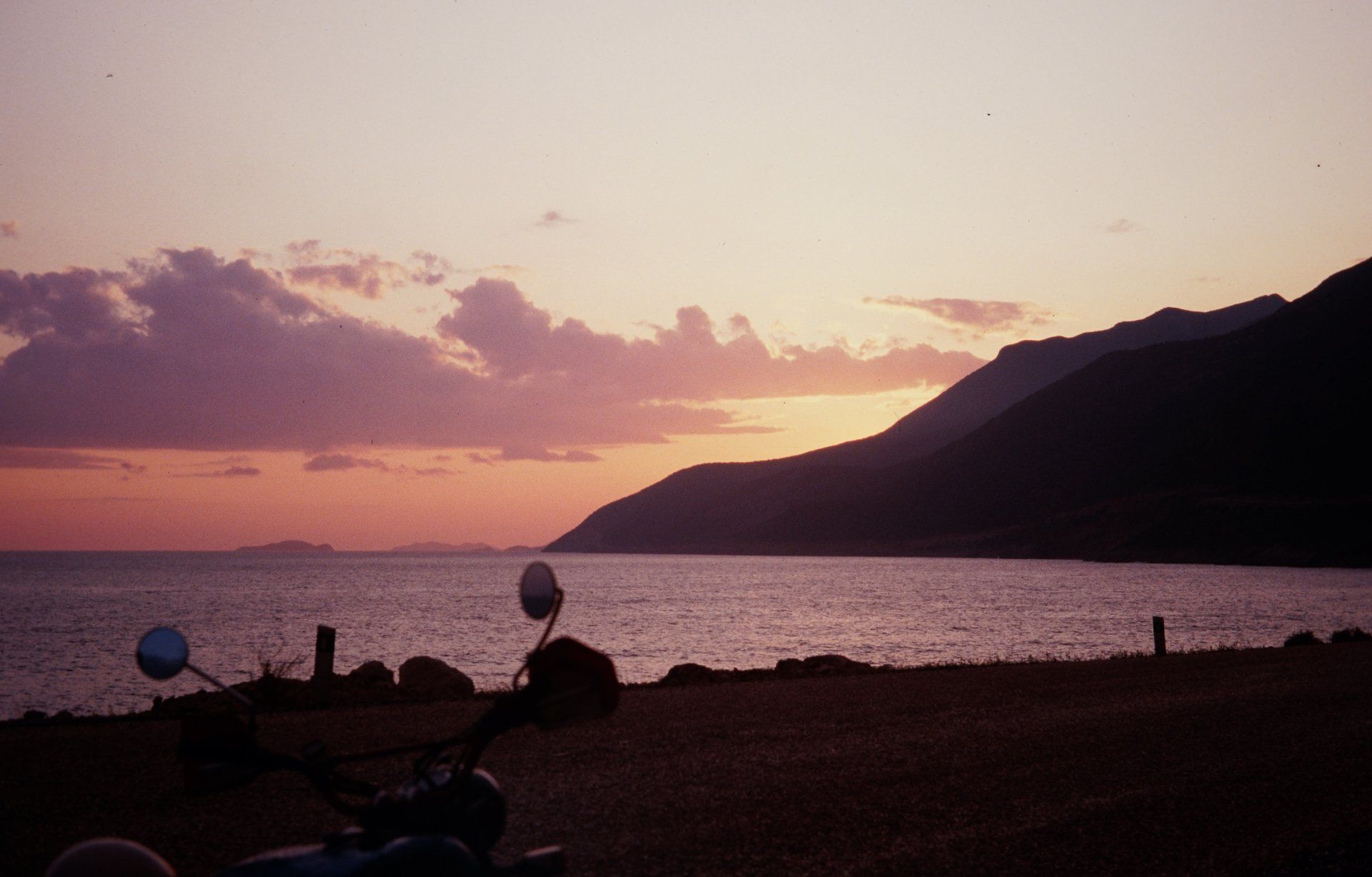 Am nächsten Morgen bestand der Hotelwirt darauf, mir statt des Touristenpreises von 700 Drachmen (knapp 10 Mark), nur 650 zu berechnen, weil Motorradfahrer keine ›richtigen‹ Touristen seien. Danach trank ich am Hafen einen eisgekühlten Milchkaffee, noch immer waren die Straßen voller festlich gekleideter Familien, viele mit kleinen Kindern, alle in weißen Anzügen oder Kleidern. Im Restaurant von gestern Abend fragte ich, ob sie mir Brot verkaufen könnten, der Kellner schenkte mir ein ganzes großes Weißbrot. Als ich zurück zum Motorrad ging, legte eine alte Dame gerade zwei hartgekochte und rot gefärbte Eier auf die Alukoffer. Ostern! Natürlich. Ich war froh über die kleine Geste, machte ein Photo der Ostereier und verstaute sie zusammen mit dem Brot sicher in der Küchenbox.