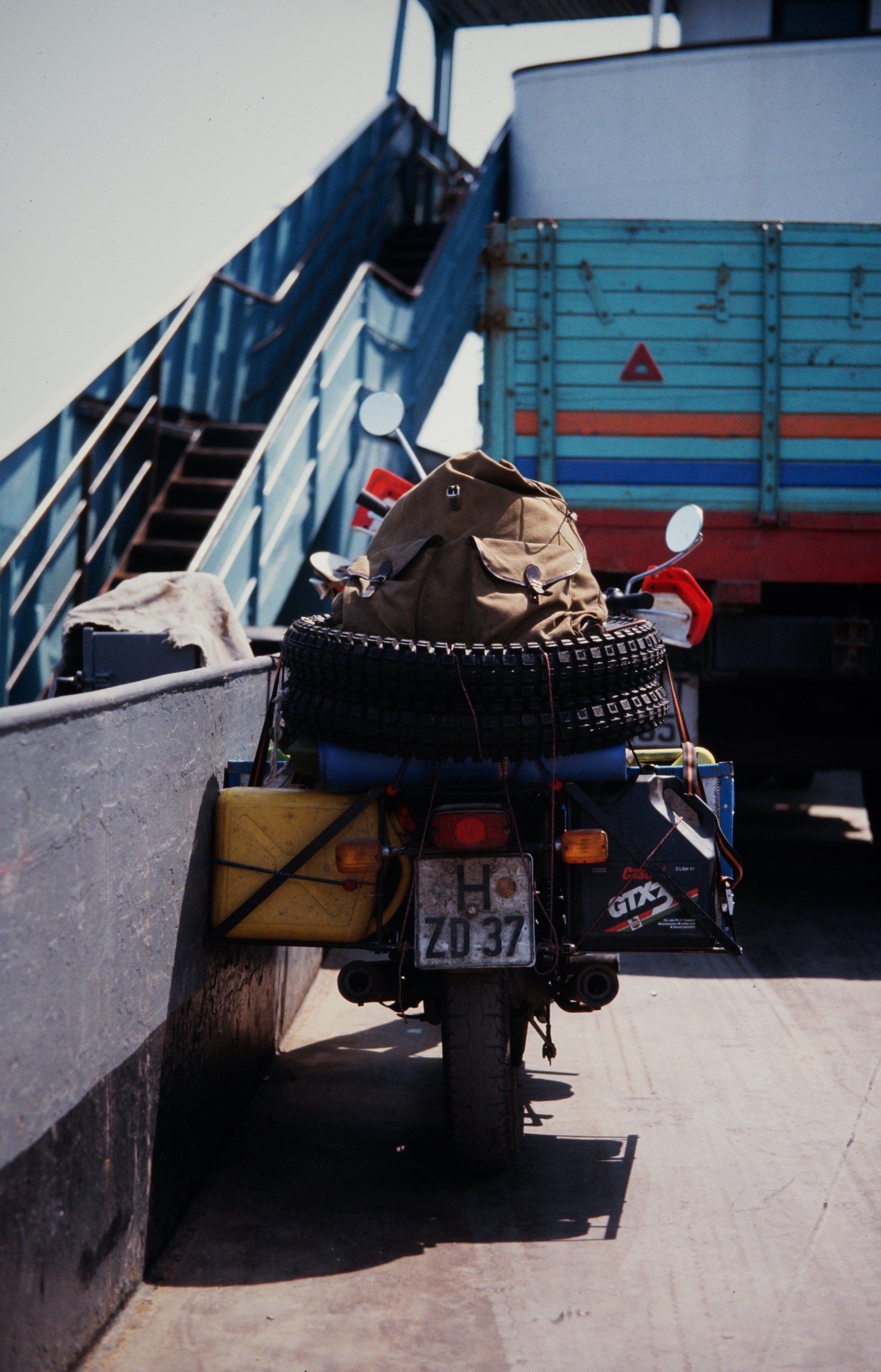 Ich behaupte, nur eines bekommen zu haben. Der Uniformierte besteht aber darauf, dass alle Fahrzeuge zwei Nummernschilder bekämen und sie das zweite schon finden würden, wenn sie nur gründlich suchten. Dabei blickt der auf seine Armbanduhr und die Fähre, die mit geöffnetem Ladebord hundert Meter entfernt steht. Ich spiele Erstaunen und erinnere mich ›plötzlich‹. Ich öffne den Verbindungsreißverschluss zwischen den beiden Tanrucksackhälften und überreiche ihm lächelnd das rot-gelbe Nummernschild. Er nickt nur und winkt mich in Richtung Fähre.
