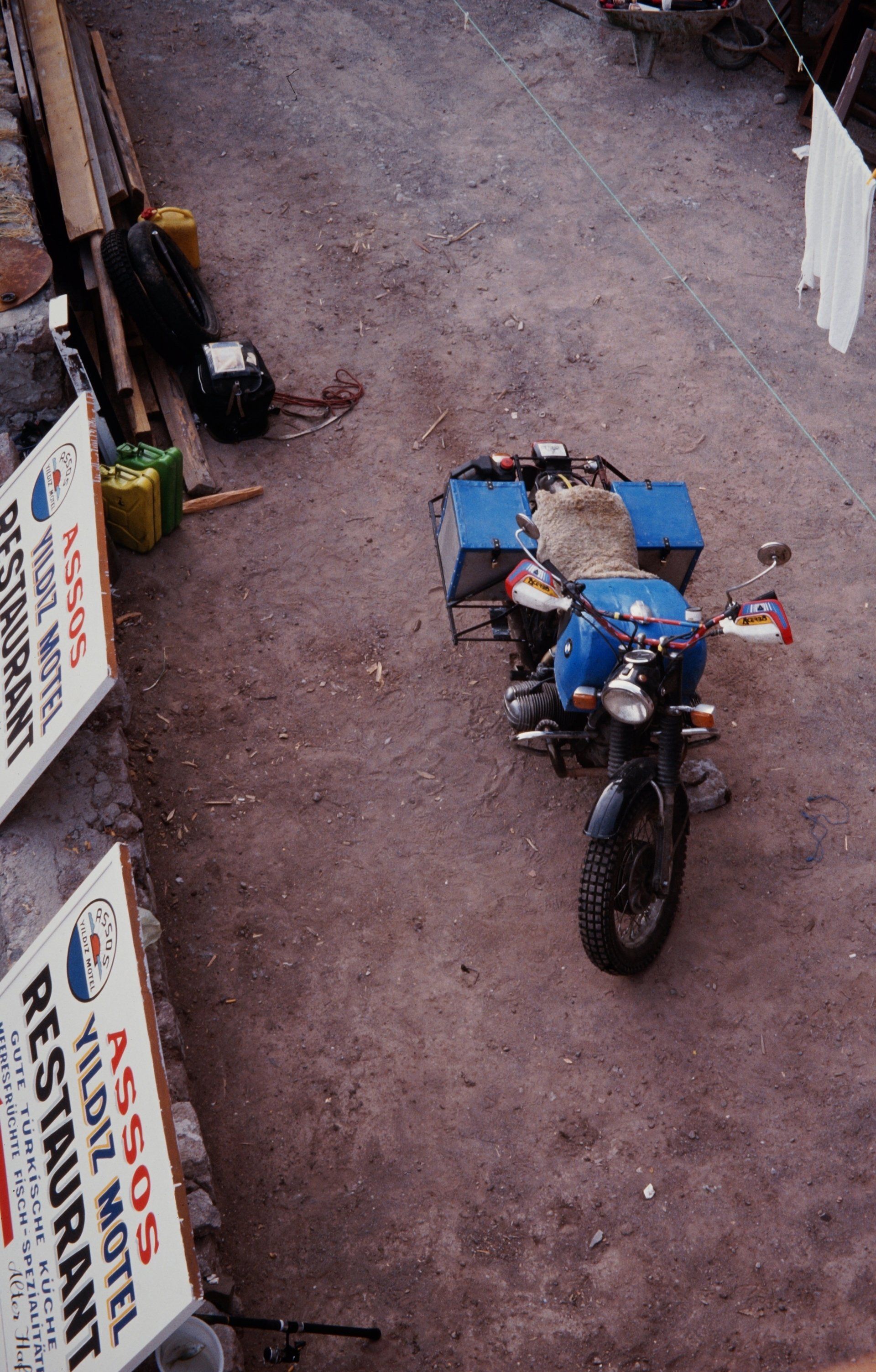 Ich höre die beiden BMWs starten und die wenigen Meter zu ihrem umzäunten Parkplatz fahren. Bei einem der Motoren klappern die Ventile ziemlich laut. Ein Blick über das Mäuerchen schafft mir Gewissheit, dass beide fast neue R 80 G/S sind. Zahnärzte, denke ich. In den letzten anderthalb Jahren, in denen ich fast jeden Tag mit meinem BMW-Lehrer Heiko verbracht habe, ist es uns zur Gewohnheit geworden die G/S als Zahnarztmototorrad zu verspotten. 10.000 Mark für ein Motorrad, dessen Wettbewerbsvariante zwar regelmäßig die Paris-Dakar gewinnt, in der Normalversion mit deutscher Straßenzulassung aber vor allem durch für BMW untypischen Verschleiss zentraler Bauteile und durch die unnötige Erregung von Aufmerksamkeit Aufmerksamkeit erregt. Heiko waren vor allem die vielen elektronischen Komponenten suspekt. Bei der Paris-Dakar mit einem LKW voller Ersatzteile kann man einen vielleicht defekten elektronischen Regler einfach austauschen, wollte man alleine durch die Wüste, konnte man einen elektro-mechanischen Regler mit Schraubenzieher, Zange und einem Stückchen Coladose reparieren. Jedenfalls war das Heikos Meinung, und wie konnte ich Heiko widersprechen? Reparieren mit Zange und Coladose ist jedenfalls schnell zu einem stehenden Begriff unter uns geworden. Trotzdem ist das untere Fach meines Tankrucksacks mit ca. 15 Kg Werkzeug gefüllt und im oberen befinden sich einige essentielle elektrische Ersatzteile. Von dem Ersatzreifen oben auf die Gepäckrollen hinter mir geschnallt, einem Päckchen Ersatzschläuchen und etlichen Ventilen, einer handvoll Speichen und dem unvermeidlichen Gaffatape, ein paar Lagen GFK und einer kleinen Dose Härter ganz zu schweigen.