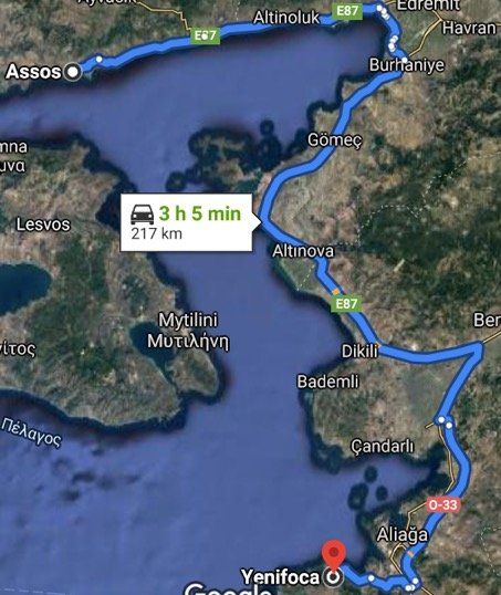 Am nächsten Morgen sitze ich unten vor‘m Hotel auf der Terrasse, trinke Nescafé mit Milch und esse in kleine Stücke gerissenes Fladenbrot mit Marmelade. Ich beobachte das Treiben in dem kleinen Städtchen und versuche mich mit dem Jungen, der uns gestern empfangen hat, zu verständigen. Über ›Guten Morgen‹, ›Danke‹, ›Bitte‹, ›Kaffee‹, ›mein Freund‹ kommen wir aber nicht hinaus. Kurz vor Mittag frage ich dann nach dem Schlüssel für das Tor zum Motorradgehege und beginne, den leider erst gestern vollgetankten Tank abzubauen. Der Ölstand ist gut, ich muss nur etwa einen Viertelliter nachfüllen. Auch der Luftfilter sieht noch so sauber aus, dass ich im Kopf die Wartungsintervalle – zumindest bei der mäßigen Beanspruchung auf Landstraßen – von fünf auf siebeneinhalb Tausend Kilometer erhöhe. Nach der soweit erfolgreichen Mission beschließe ich, mir auf der Terrasse einen Çay zu gönnen. Beim Blick auf die gegenüberliegende Insel fällt mir wieder ein, was Wowa gestern von Lesbos und Assos erzählt hat: Assos sei von Siedlern von der Insel Lesbos gegründet worden und einst eine wohlhabende Handelsstadt gewesen. Die eigentliche Stadt liegt hinter mir auf und um den Felsgipfel, der die Küste weit überragt. Aristoteles hat sich nach dem Tod eines Lehrers und Freundes Platon hierhin zurückgezogen, ist aber schon nach ein paar Jahren nach Mytilene auf Lesbos weitergezogen. Nach Wowas Meinung, weil er sich von Mytilene, der Heimat der großen antiken Dichterin Sappho, Inspiration für seine philosophische Arbeit erhoffte. Platon hatte Sapphos Gedichte so geschätzt, dass er sie in den Rang einer Muse erhob. Außerdem war Wowa überzeugt, dass die Besiedlung von Lesbos auf die realen Vorbilder der mythischen Amazonen aus dem kleinasiatischen Hinterland zurückging. Ein matrilinear und matriarchisch geprägter Stamm, von dem auch Sappho direkt abstammen soll.