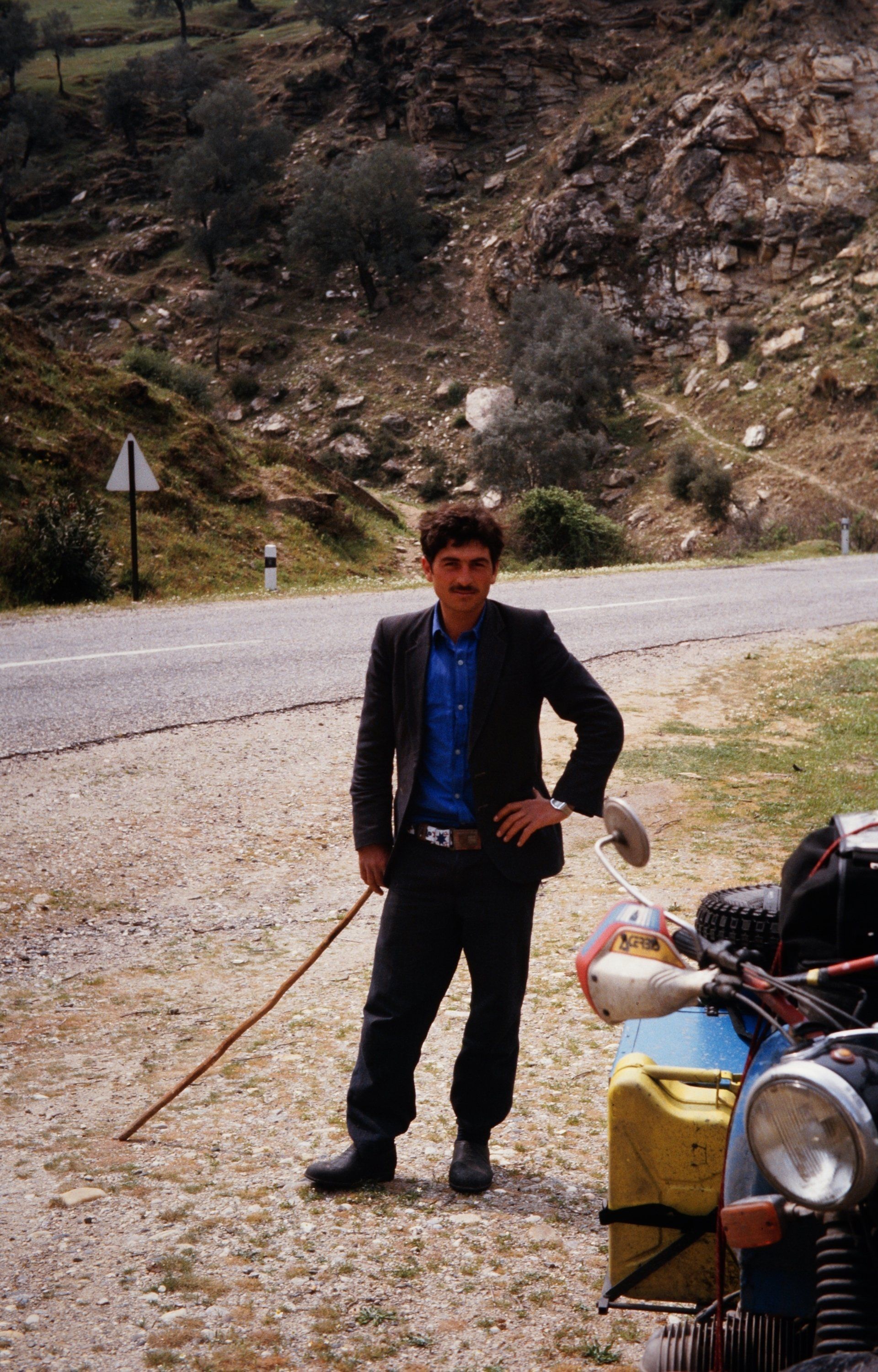 Zum Frühstück gibt es das übliche Fladenbrot mit Marmelade und einen Nescafé mit Milch. Um kurz nach Neun bin ich schon wieder auf der Straße. Das Erkältungsgefühl von gestern war wohl falscher Alarm. Als ich wieder auf die Fernstraße einbiege scheint noch die Sonne, aber kurz vor Izmir – die Landstraße ist inzwischen eine Autobahn geworden – ziehen dicke dunkelgraue Wolken im Südosten auf – oder ab, Izmir steht halb unter Wasser. Laster wirbeln graue Gischt auf, aber der Regen ist offenbar schon vorbei. Hinter Izmir führt mein Weg durchs Landesinnere in sicherem Abstand zu den Touristenhochburgen Kuşadasi, Bodrum und Marmaris. In einer langgezogenen Linkskurve öffnet sich vor mir das weite Tal des Mäander, hinter einer Stadt steigt die Straße in ein kleines Seitental an. Nach dem Anstieg befinde ich mich auf einer großen Hochebene, die auf allen Seiten von grün-schwarzen Bergen überragt wird. Die kleinen Ortschaften sind von Olivenhainen umgeben. Nach einem kilometerlangen schnurgeraden Teilstück am südlichen Ende der Hochebene beginnt der Abstieg durch eine malerische Schlucht. An einem kleinen Zwischenpass überquert eine Herde Schafe die Straße. Ich parke das Motorrad auf einer steinige Wiese neben der Straße und genieße den Ausblick. Der Schafhirte in Anzughose, Jeanshemd und Wollsakko erscheint und begrüßt mich mit vor der Brust zusammengelegten Händen. Er scheint sich für die Behinderung durch seine Schafe zu entschuldigen, ich versuche ihm klar zu machen, dass alles wunderbar ist und ich einfach nur die Landschaft genieße. Ich biete eine Zigarette an, die er nach einigem Zögern annimmt. Erst als er sich nach seinen Ziegen umdreht, sehe ich, dass er einen Gürtel mit großkalibrigen Patronen trägt, die Flinte hat er scheinbar irgendwo zurückgelassen, um keine Touristen zu erschrecken.