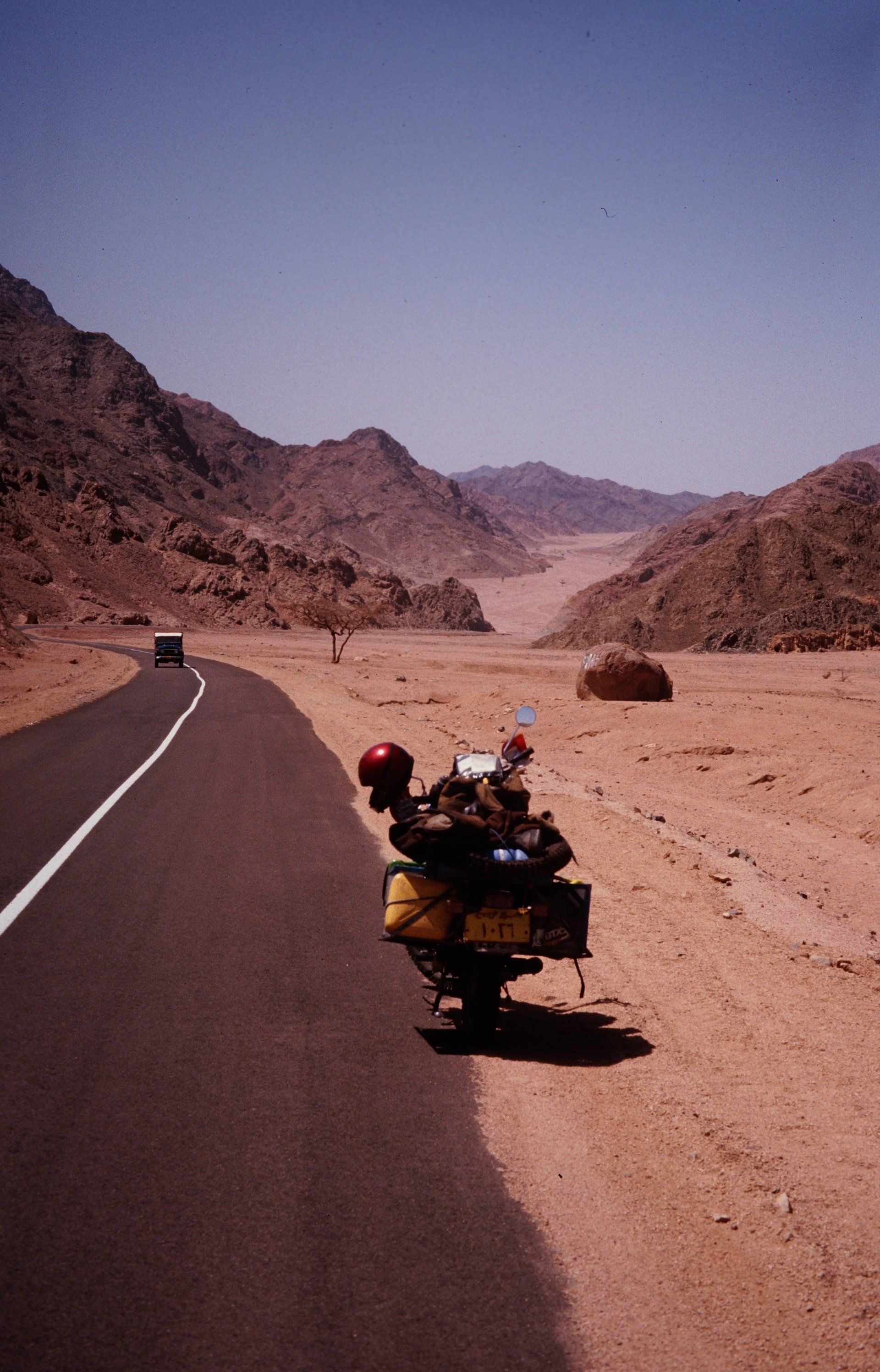 Es ist unerträglich heiß. Zum Glück habe ich heute zwei Begleitfahrzeuge mit Kühlschränken dabei, so dass es bei den kurzen Stopps wenigstens kaltes Wasser zu trinken gibt. Ich habe meinen Photoapparat einem der beiden Schwaben gegeben, damit ich auch mal ein paar Photos von mir während der Fahrt habe. Nach ca. 50 km sehe ich rechts der Straße die Trasse der alten Piste. Ich signalisiere den anderen zu halten und sage ihnen, dass ich ein Stück auf der alten Piste fahren will. In einer leichten Kurve kreuzt die neue Asphaltstraße die Piste und ich zweige ab. Der Untergrund ist relativ hart, also leicht zu fahren. Trotzdem stelle ich mich auf die Fußrasten, presse die Knie an den Tank und versuche hauptsächlich mit den Knien zu lenken. An manchen Stellen hat die Piste tiefe Spurrinnen mit weichem Sand darin, die ich versuche zu umfahren, wo das nicht geht, fahre ich mit Druck auf dem Hinterrad hindurch und lasse dem Vorderrad so weit es geht die Freiheit, sich selbst den besten Weg zu suchen. Größtenteils fnktioniert das ganz gut. Einmal kommt die schwere Fuhre aber sehr ins Schlingern. Ich muss noch Erfahrung sammeln, um in solchen Situationen nicht in Panik zu verfallen und, gelassen durch Gasgeben die Kontrolle zurückzugewinnen.