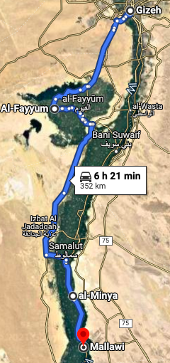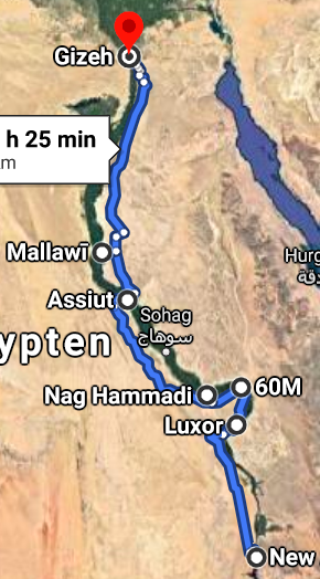 Der anstrengendste und wahrscheinlich gefährlichste Tag der ganzen Reise. Um halb neun ist die BMW reisefertig und ich fahre Richtung Luxor aus Assuan heraus. Um elf mache ich in Qena in einer klimatisierten Tankstellen-Raststätte eine ausgedehnte Mittagspause. Um eins bin ich wieder auf der Straße. Weil ich schon um halb vier kurz vor Asyut bin, beschließe ich, bis Gizeh weiter zu fahren. Bei einem kurzen Stopp putze ich mit dem Halstuch meine Brille. Ein kleiner Junge guckt mir zu und macht die übliche drehende Bewegung mit der rechten Hand, die Unverständnis signalisiert. Vor El Minya wird es dunkel, ich fahre nun nur noch maximal 80 km/h und erwarte jeden Moment einen unbeleuchtetes Fahrzeug oder irgendein Tier auf der Straße. Erschwert wird alles von der Angewohnheit der anderen Fahrzeuge alle paar Sekunden das Fernlicht für einen Moment einzuschalten. Als vor mir ein VW Käfer auftaucht, der ca. 100 km/h fährt, hänge ich mich mit Sicherheitsabstand hinten ‘ran. Falls tatsächlich irgendwo ein Esel oder ein Fahrrad ohne Licht unterwegs ist, sehe ich es an der Reaktion des Käfers hundert Meter vor mir. In Bani Suwaif, 150 km vor Gizeh, biegt der Käfer leider ab. Das Fahren wird wieder zur Tortur. Zwanzig Kilometer weiter überholt mich ein Tankwagen zügig. Dankbar nehme ich das unfreiwillige Angebot an und folge nun dem bis zu 120 km/h schnellen rot-gelben Sattelschlepper. Kurz vor zwölf komme ich völlig erschöpft auf dem Campingplatz von Mrs. und Mr. Saïd an. Ich sehe einige der Motorräder, die ich schon in Assuan getroffen habe. Ich baue nur noch nachlässig das Zelt auf und lege mich erschöpft schlafen.