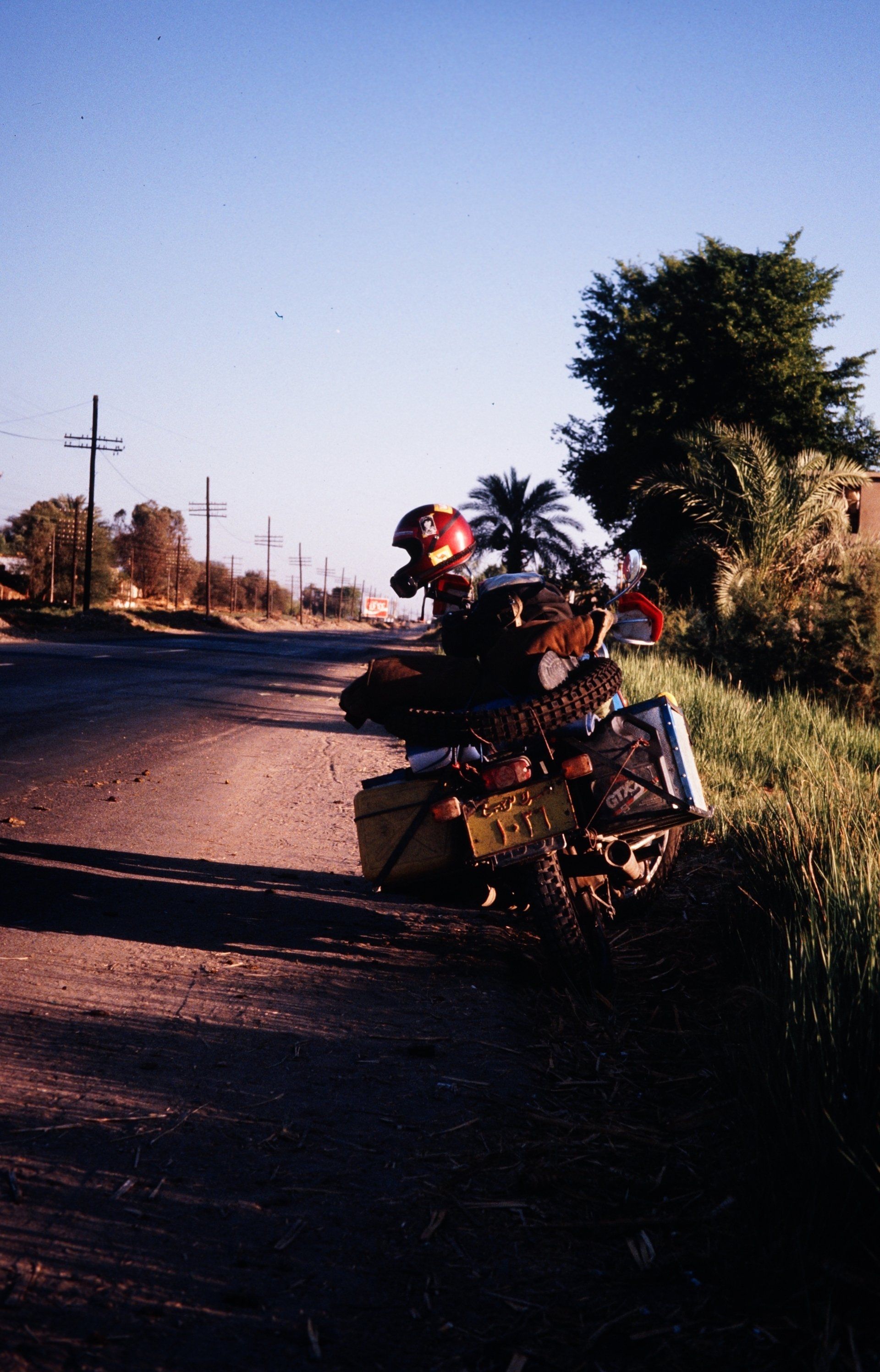 Ein beschaulicher Pfingstsonntag auf dem Weg nach Assuan. Irgendetwas ist heute anders. Ich oder die Ägypter? Entspannt fahre ich durch eine beschauliche grüne Landschaft am rechten Nilufer, mache sogar immer wieder kurze Stopps für Photos. Auf einer schnurgeraden Landstraße vor Kom Ombo kommt mir eine 600er XT in Zebra-Lackierung entgegen. Im Rückspiegel sehe ich das rot-gelbe in Ägypten obligatorische Ausländer-Nummernschild. Die XT hält aber nicht, ich fahre ebenfalls weiter. Später sehe ich während einer Zigarettenpause, dass am Hinterreifen einer der Gummistollen fehlt, die Bruchkante sieht aus, als wäre der Stollen einfach herausgerissen. Hartes Gelände hatte ich bisher noch nicht, ebenfalls keine schnellen Autobahnetappen.