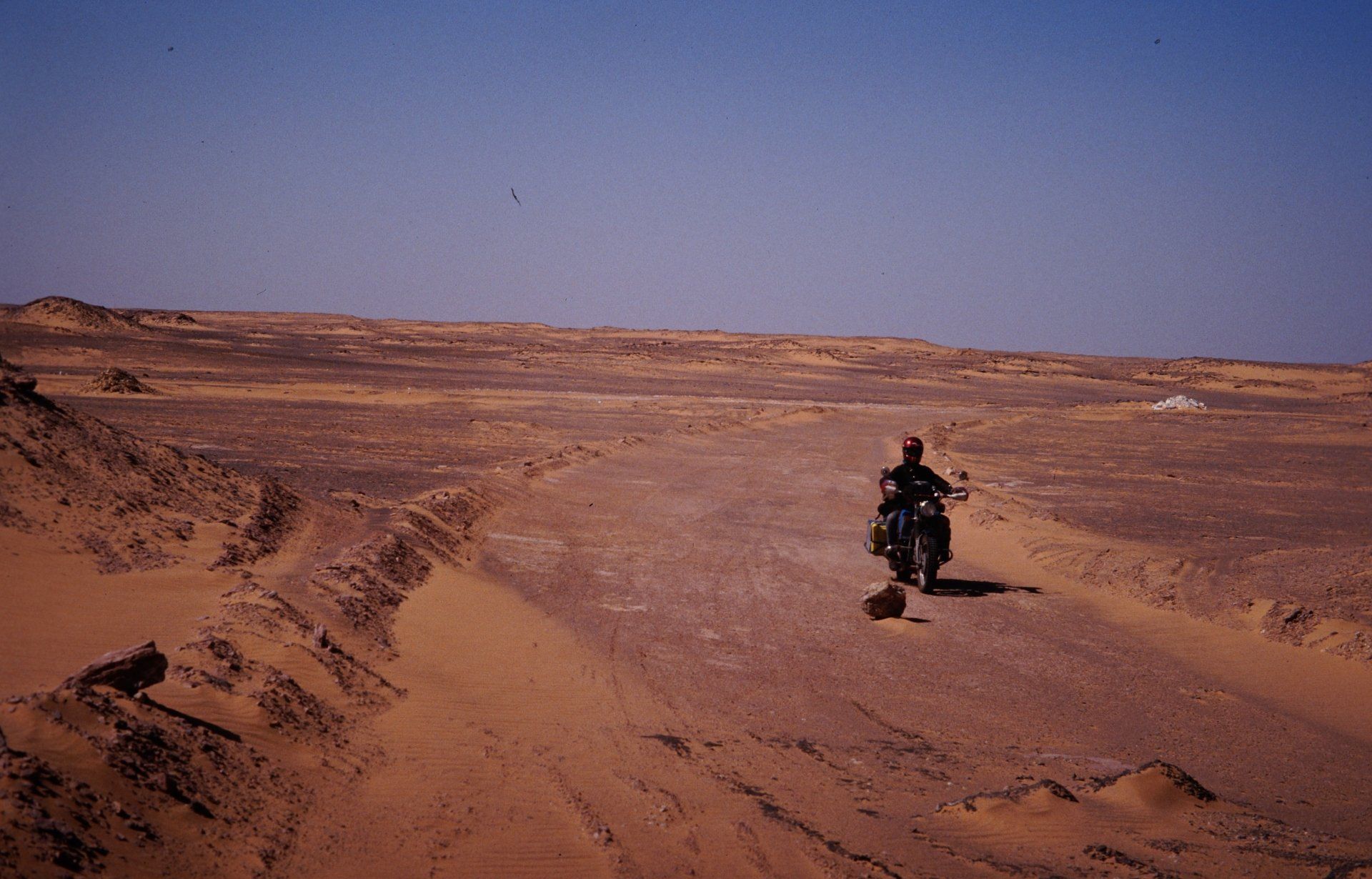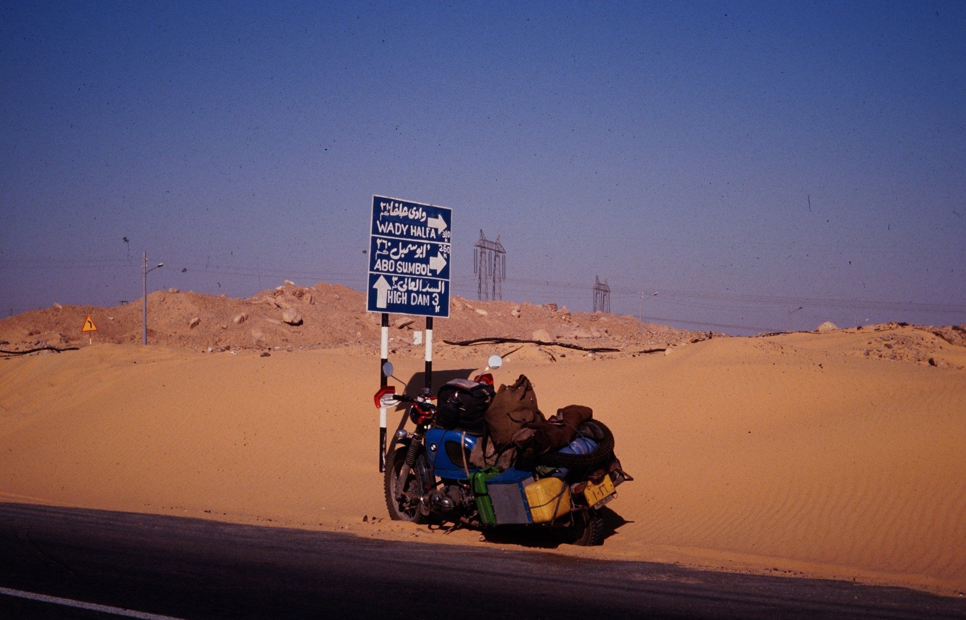 »Meinst Du nicht, Deine BMW ist ein bisschen schwer für eine Saharadurchquerung?« - »Ja, vielleicht schon, aber jedenfalls ist sie zuverlässig. Und meine Sorge ist gar nicht Algerien, sondern das erste Stück Sudan von Wadi Halfa nach Khartoum wird schwierig, vor allem die Navigation.« - »Ach, das machst Du schon. Klingt doch alles durchdacht.« - »Ja, wird schon gutgehen. Aber Übermut tut selten gut.« Der neue Tom lacht. Endlich habe ich jemanden gefunden, dem ich meine Bedenken ausbreiten kann und der mir trotzdem zuredet. Endlich sind die Rollen vertauscht. »Kennst Du Ted Simon?« - »Sicher!« Jupiters Fahrt von Ted Simon war meine wichtigste psychlogische Resevorbereitung, natürlich eine Empfehlung von Heiko. Ted Simon ist in den ‘70ern auf einem völlig ungeeigneten Motorrad, einer 650 ccm Straßen-Triumph einmal rund um die Erde gefahren. Nach einer Menge von Wetter-, Dinge-verlieren- und Bürokratieproblemen hatte er im Nord-Sudan seine erste ernste Motorradkrise. Weder er noch sein Motorrad waren vorbereitet auf schlechte Pisten mit Sandverwehungen und schwierige Navigationsverhältnisse. Diese Etappe war die einzige, die meine mit Ted Simons Tour gemeinsam hatte. Obwohl ich sicher war, dass meine BMW für dieses Teilstück besser geeignet war als seine Triumph wusste ich von der Problematik. Ted Simon war seinerzeit völlig überrascht von den Schwierigkeiten. Insgesamt standen meine Chance also besser als die von Ted Simon und auch er war ja schließlich in Khartoum angekommen. Alle diese Gedanken teile ich mit Tom, der aufmerksam zuhört und dann und wann Zustimmung zeigt. »Aber vor dieser schwierigen Etappe muss ich überhaupt mal in den Sudan ’reinkommen. Die Landgrenze ist von ägyptischer Seite wegen irgendwelcher politischer Streitigkeiten seit Jahren geschlossen und von den beiden Fähren für Fahrzeuge ist letztes Jahr eine gesunken und die andere abgebrannt.