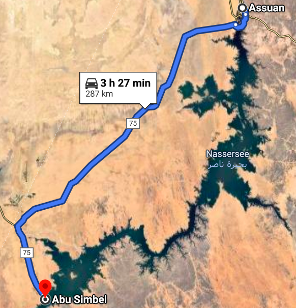 Die drei wollen mittags losfahren, dann sind es 45° im Schatten, allerdings gibt es nirgends Schatten. Mal sehen, wie das wird. Ich fahre erstmal in mein Café, wo wir uns gegen 14 Uhr treffen wollen. Tatsächlich kommen die drei pünktlich um halb zwei fröhlich die Treppe zum Café herunter. Wir trinken noch jeder eine kalte Cola und sind um zwei unterwegs. Wir fahren südlich, Richtung Hafen, aus der Stadt hinaus, vor dem Staudamm biegen wir an einem halb von den Dünen begrabenen Wegweiser auf die Abu Simbel Road ab.
