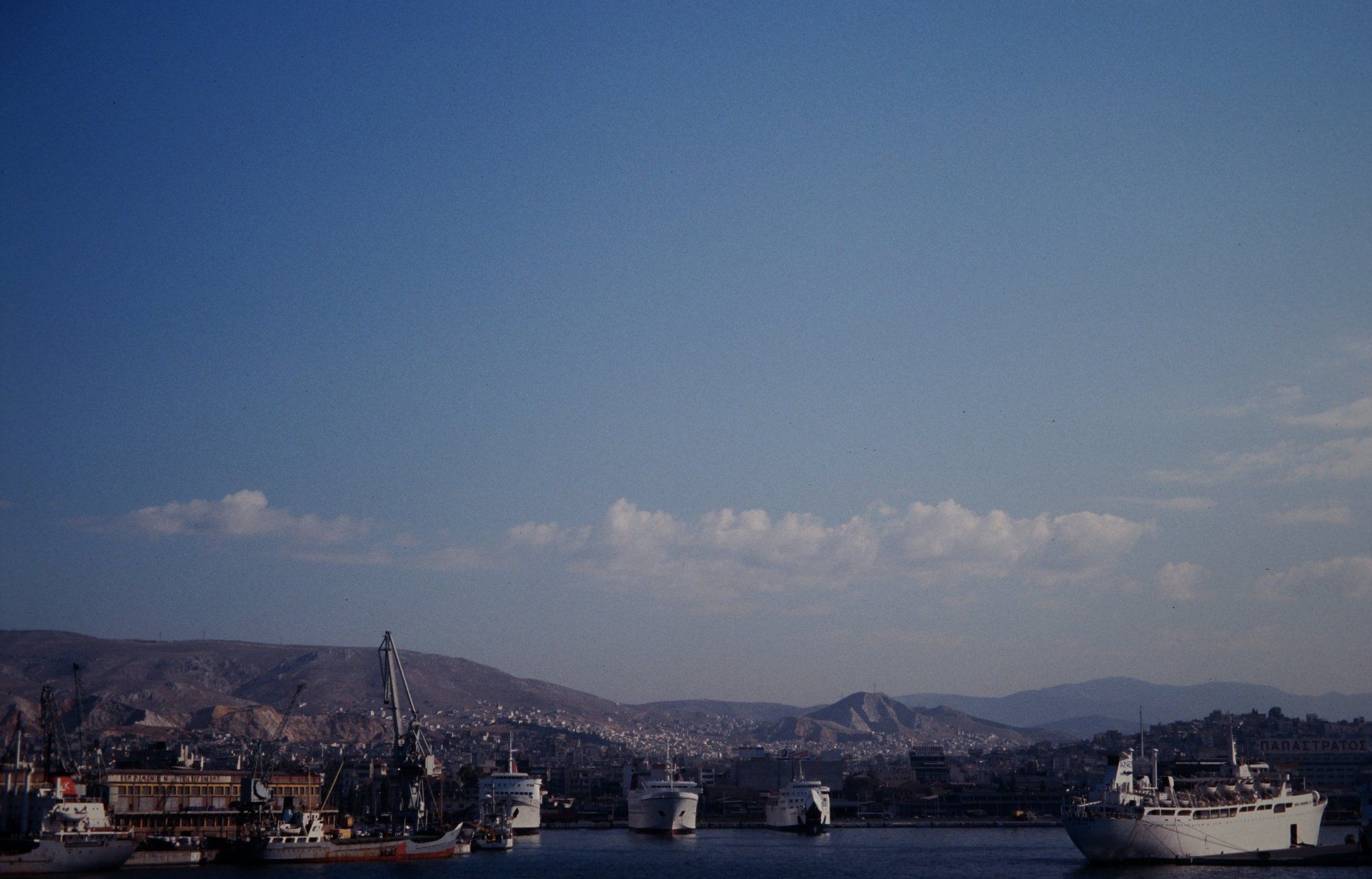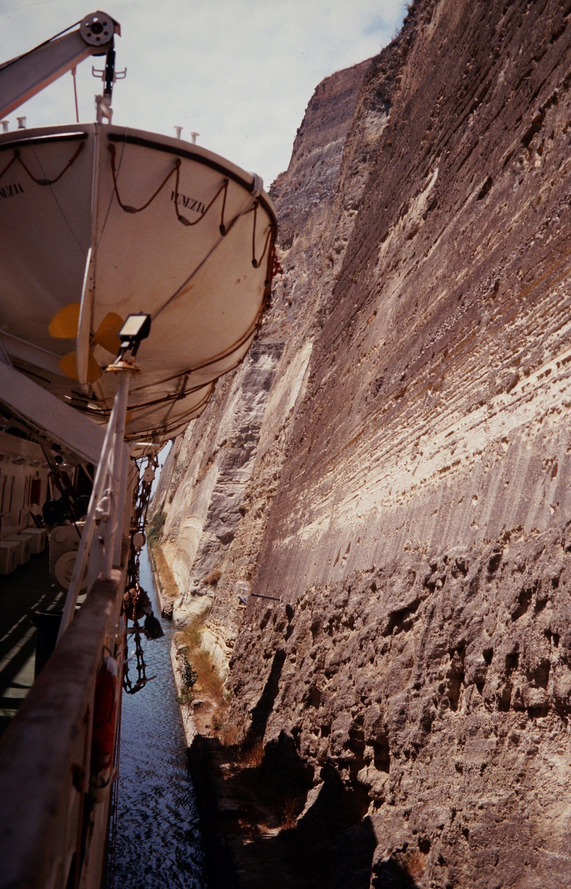 Mittags läuft das Schiff Piräus, den Hafen von Athen, an. Etliche Fahrzeuge gehen von Bord und ein paar Reisende nutzen den Aufenthalt für einen Landgang, ich bleibe an Bord und beobachte das Treiben des Ent- und Beladens im Hafen. Auf dem Aussichtsdeck ist es ungewohnt ruhig. Neben uns liegt das italienische Kreuzfahrtschiff ›Achille Lauro‹, das vor zwei Jahren von palästinensischen Terroristen entführt worden war. Ein US-amerikanischer Passagier wurde getötet. Nachmittags verlassen wir Piräus wieder und nehmen Kurs auf den Kanal von Korinth. Die Schiffe in Westrichtung müssen warten bis ein Konvoi aus Westen den schmalen Kanal verlassen hat. Im Kanal sind die steilen Felswände buchstäblich zum Greifen nahe.
