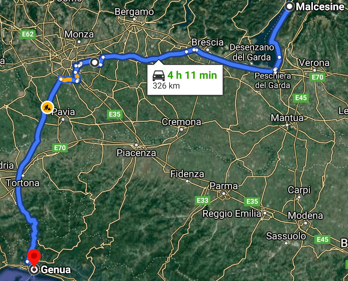 Um eins sind wir dann tatsächlich auf der Autobahn Richtung Mailand, vor Mailand zweigt unser Weg nach Genua Richtung Süden ab. Es ist glänzendes Motorradwetter, kaum zu glauben, dass wir vor zwei Tagen noch frierend durch norddeutsches Schneetreiben gefahren sind. Am späten Nachmittag sind wir in der Innenstadt von Genua unterwegs zum Hafen.