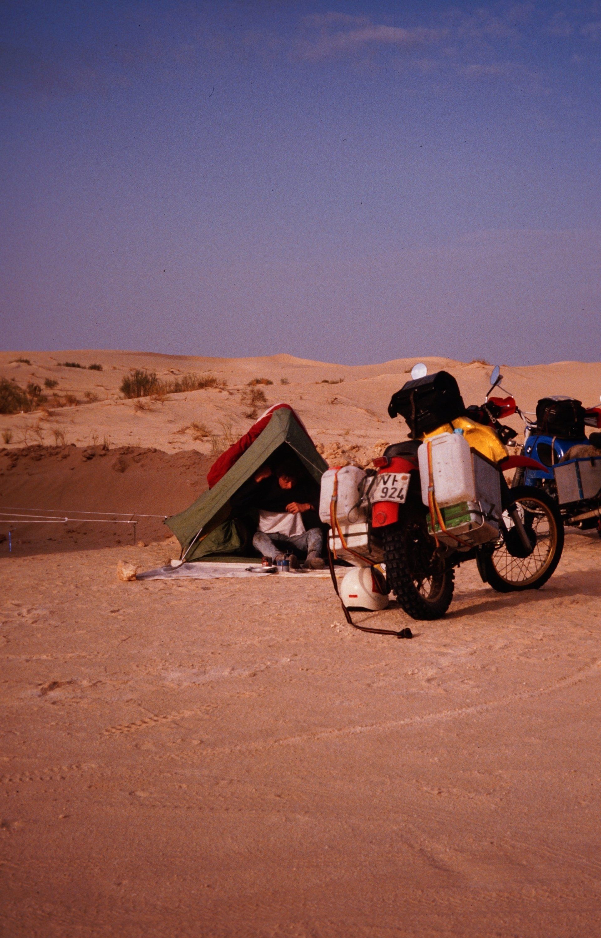 Ich wache kurz nach Sonnenaufgang auf. Ich bin alleine im Zelt. Chrischi kommt nach ein paar Minuten zurück. »Ich glaube, wir müssen noch ein bisschen bleiben, ich hab‘ Durchfall. Wahrscheinlich war das Couscous in Kairouan nicht gut.« - »Hätte schlimmer kommen können. Der Platz hier ist doch perfekt für eine kleine Pause. Obwohl ich glaube dass es sich zuzieht.« Ich zeige zum kleinen Ausschnitt Himmel, den wir durch den geöffneten Zelteingang sehen können, wo wieder einmal eine kleine Wolke zu sehen ist, aber Chrischi ist nicht nach Witzen zumute, er ärgert sich. Ich finde die erzwungene Unterbrechung am Rand der Sahara sehr gut. Wir können hier in aller Ruhe unsere Motorräder auf die nächsten Wochen vorbereiten und uns noch mal mit allem Komfort erholen.