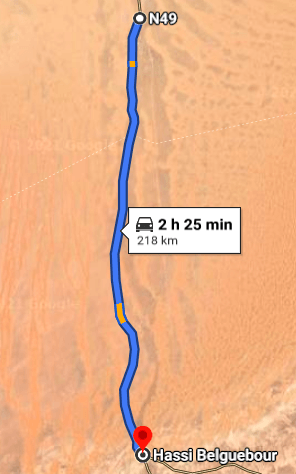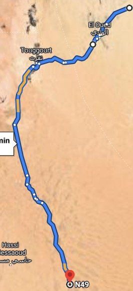In der Mittagshitze fahren wir durch das staubige, verlassen aussehende Hassi-Messaoud, kurz hinter der Stadt biegen wir von der Straße nach El Borma an der libyschen Grenze ab und fahren in das Gassi Touil hinein, wir befinden uns in einem 300 km langen schnurgeraden Tal, das den Grand Erg Oriental von Nord nach Süd durchschneidet und vor Jahrtausenden einen Fluss vom N‘Ajjer-Gebirge zum Mittelmeer leitete. Felsmalereien in der ganzen Gegend zeugen von menschlicher Besiedlung, einem reichen Wildtierbestand und gemäßigtem Klima.
