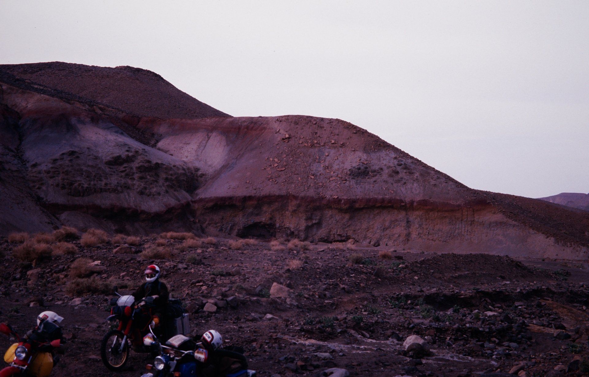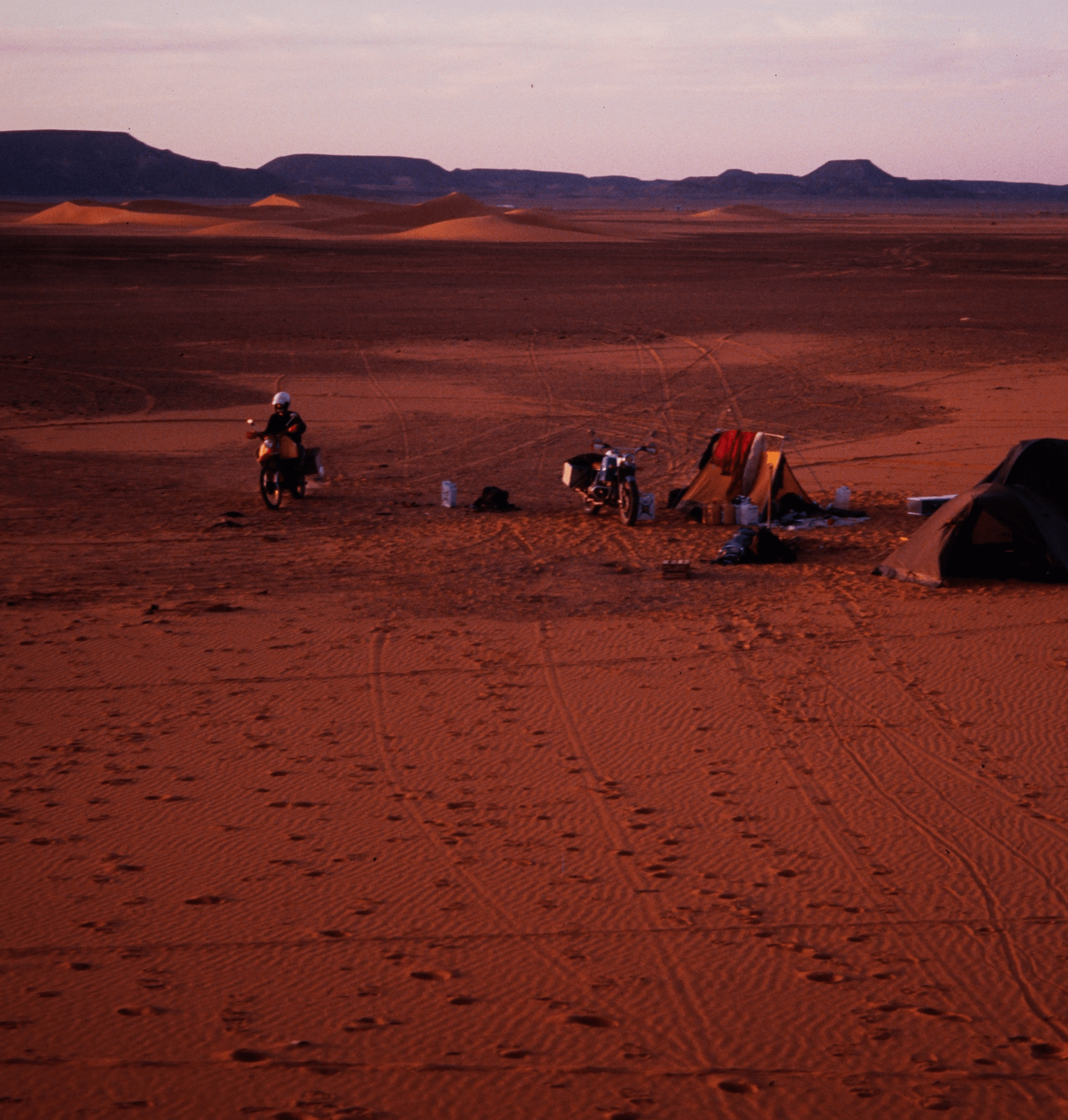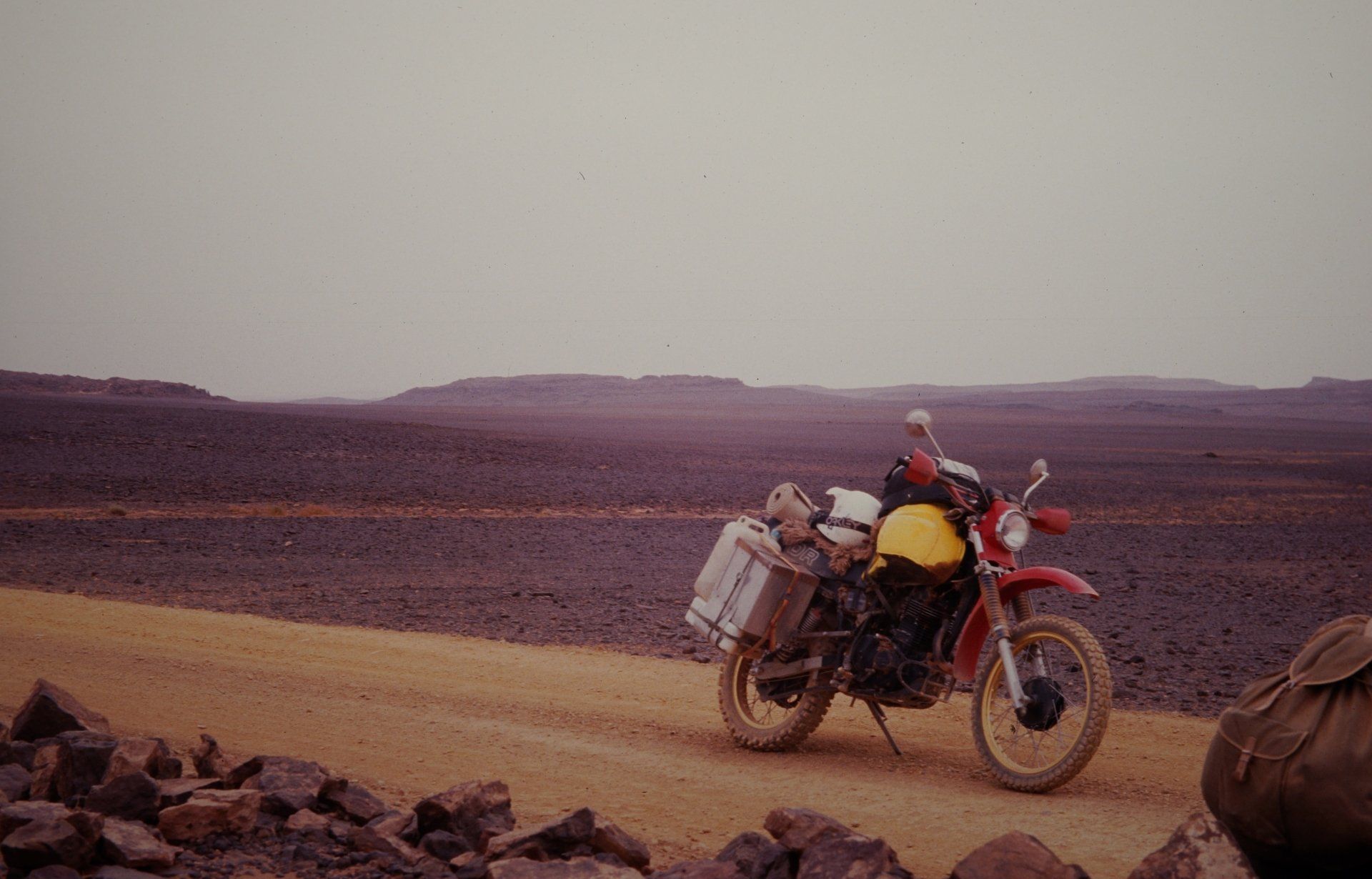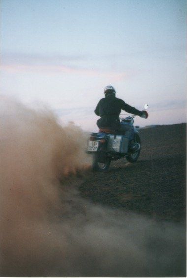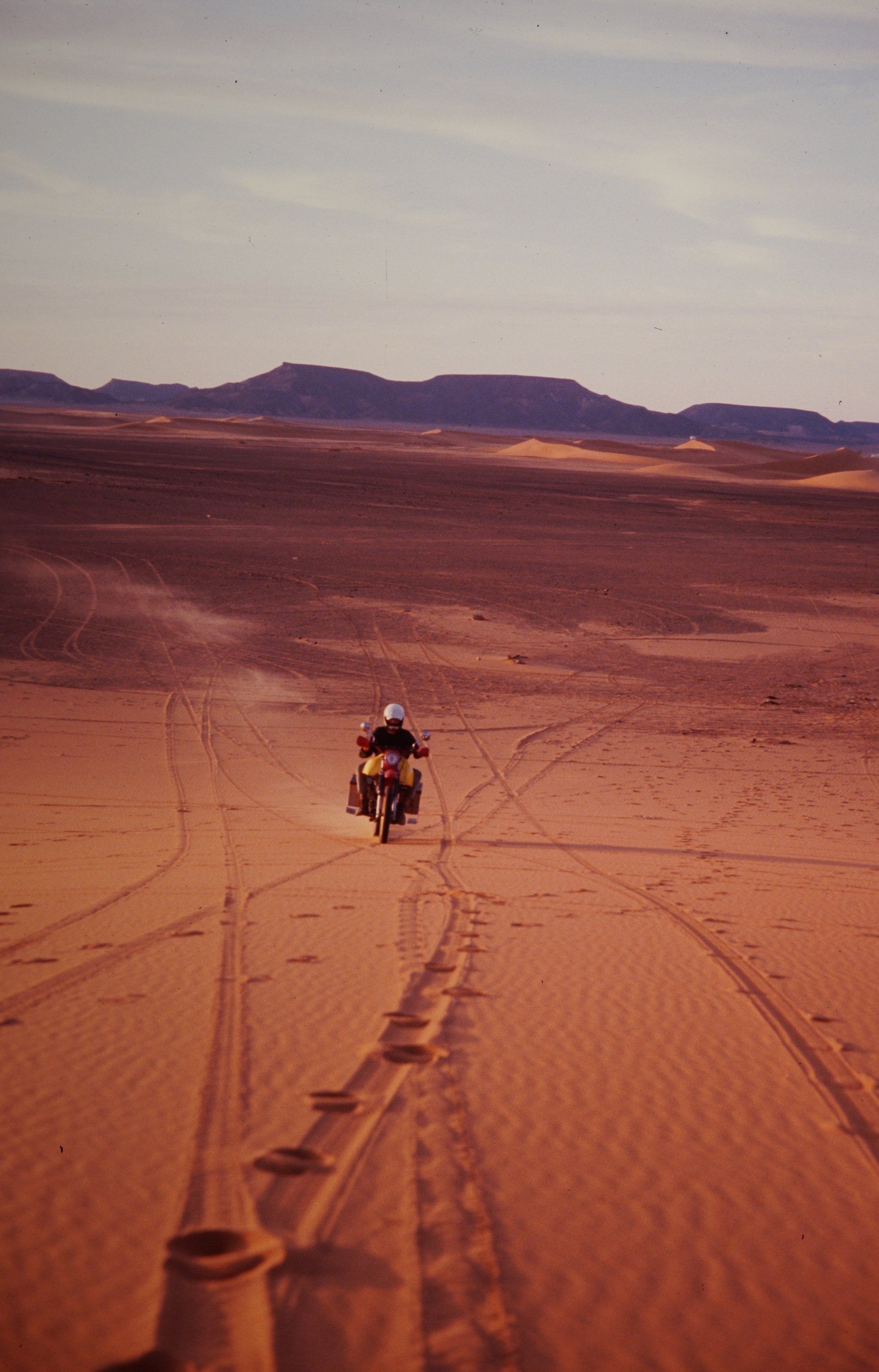 Den Sommer nach der Rückkehr aus dem Nahen Osten (s. 1987-Levante) habe ich mit Ande in Südfrankreich und Katalonien verbracht, schließlich hatte ich noch allerhand Zeit und trotz der teuren Rückfahrt per Fähre auch noch einiges Geld übrig. Ab Spätsommer war dann wieder Geldverdienen und Motorradoptimierung an der Reihe, denn schon während der Rückfahrt war klar, dass ich im kommenden Frühjahr den fehlenden Schlag der Reise im westlichen Nordafrika nachholen wollte – im arabischsprachigen Raum: ›da, wo die Sonne untergeht‹ = ›Maghreb›, das ›gh‹ ist ein norddeutsches Rachen-›R‹, das ›r‹ ein süddeutsches Zungen-›R‹ -. Im Herbst konnte ich dann meinen alten Kumpel Chrischi überreden, sein Sommersemester an der juristischen Fakultät der Uni Mainz leicht verspätet Ende April zu beginnen, so dass wir zusammen im März und April in die algerische Sahara reisen konnten. Über den Winter habe ich die Federung der BMW weiter optimiert, nebenbei wurde auch die Farbgebung von so-bunt-wie-möglich auf BMW-weiß-blau umgestellt, vor allem aber der Motor grundlegend umgebaut. Die BMW hatte nun ca. 860 ccm Hubraum, ca. 50 PS und ein erschreckendes Drehmoment, außerdem konnte wegen der geringeren Verdichtung praktisch jede Art von Benzin getankt werden. Die Räder und Reifen und den Gepäck- und Vorratstransport habe ich so belassen, wie es sich 1987 im Nahen Osten bewährt hatte.