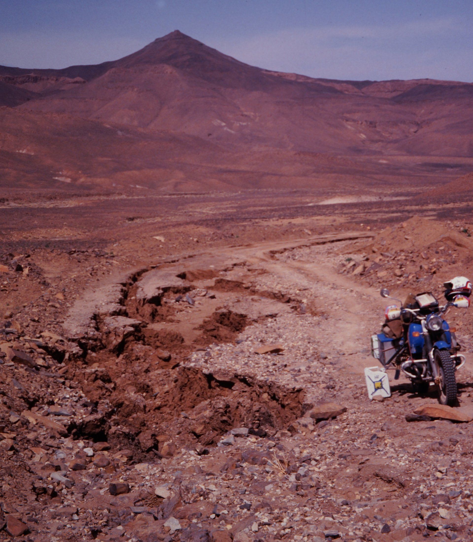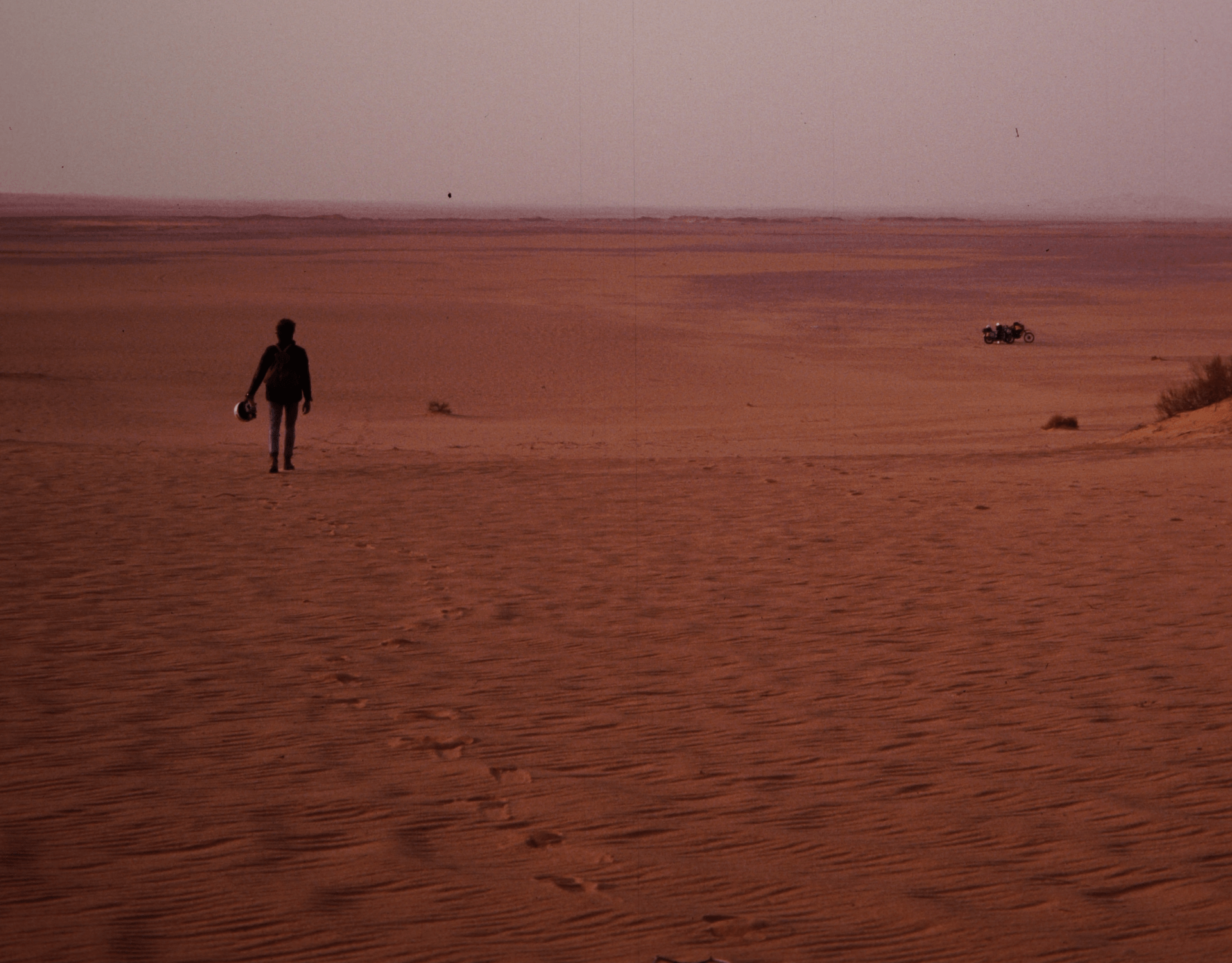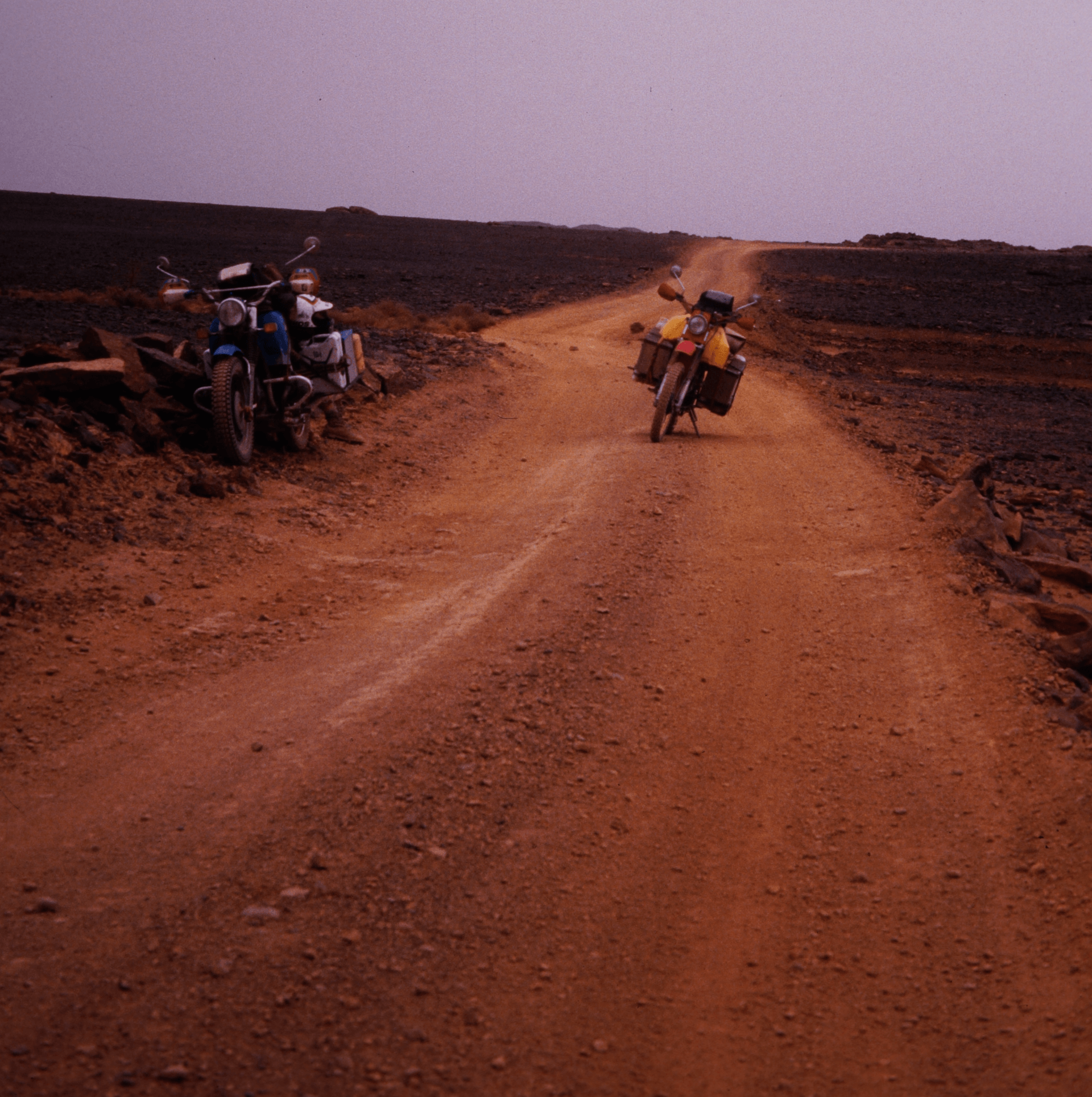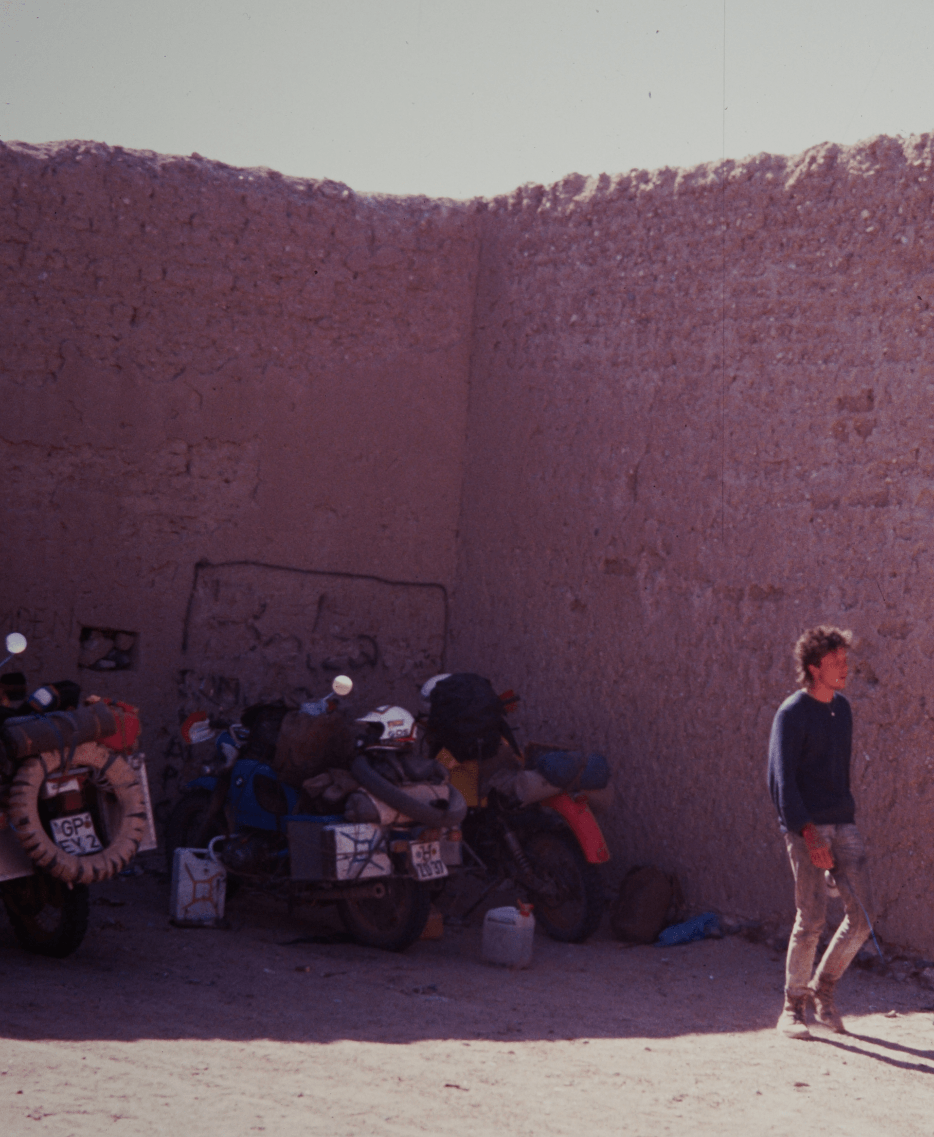 Den Sommer nach der Rückkehr aus dem Nahen Osten (s. 1987-Levante) habe ich mit Ande in Südfrankreich und Katalonien verbracht, schließlich hatte ich noch allerhand Zeit und trotz der teuren Rückfahrt per Fähre auch noch einiges Geld übrig. Ab Spätsommer war dann wieder Geldverdienen und Motorradoptimierung an der Reihe, denn schon während der Rückfahrt war klar, dass ich im kommenden Frühjahr den fehlenden Schlag der Reise im westlichen Nordafrika nachholen wollte – im arabischsprachigen Raum: ›da, wo die Sonne untergeht‹ = ›Maghreb›, das ›gh‹ ist ein norddeutsches Rachen-›R‹, das ›r‹ ein süddeutsches Zungen-›R‹ -. Im Herbst konnte ich dann meinen alten Kumpel Chrischi überreden, sein Sommersemester an der juristischen Fakultät der Uni Mainz leicht verspätet Ende April zu beginnen, so dass wir zusammen im März und April in die algerische Sahara reisen konnten. Über den Winter habe ich die Federung der BMW weiter optimiert, nebenbei wurde auch die Farbgebung von so-bunt-wie-möglich auf BMW-weiß-blau umgestellt, vor allem aber der Motor grundlegend umgebaut. Die BMW hatte nun ca. 860 ccm Hubraum, ca. 50 PS und ein erschreckendes Drehmoment, außerdem konnte wegen der geringeren Verdichtung praktisch jede Art von Benzin getankt werden. Die Räder und Reifen und den Gepäck- und Vorratstransport habe ich so belassen, wie es sich 1987 im Nahen Osten bewährt hatte.