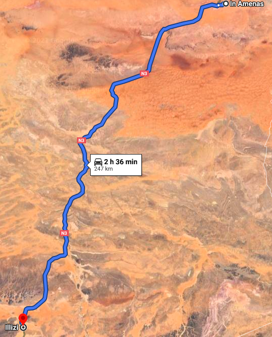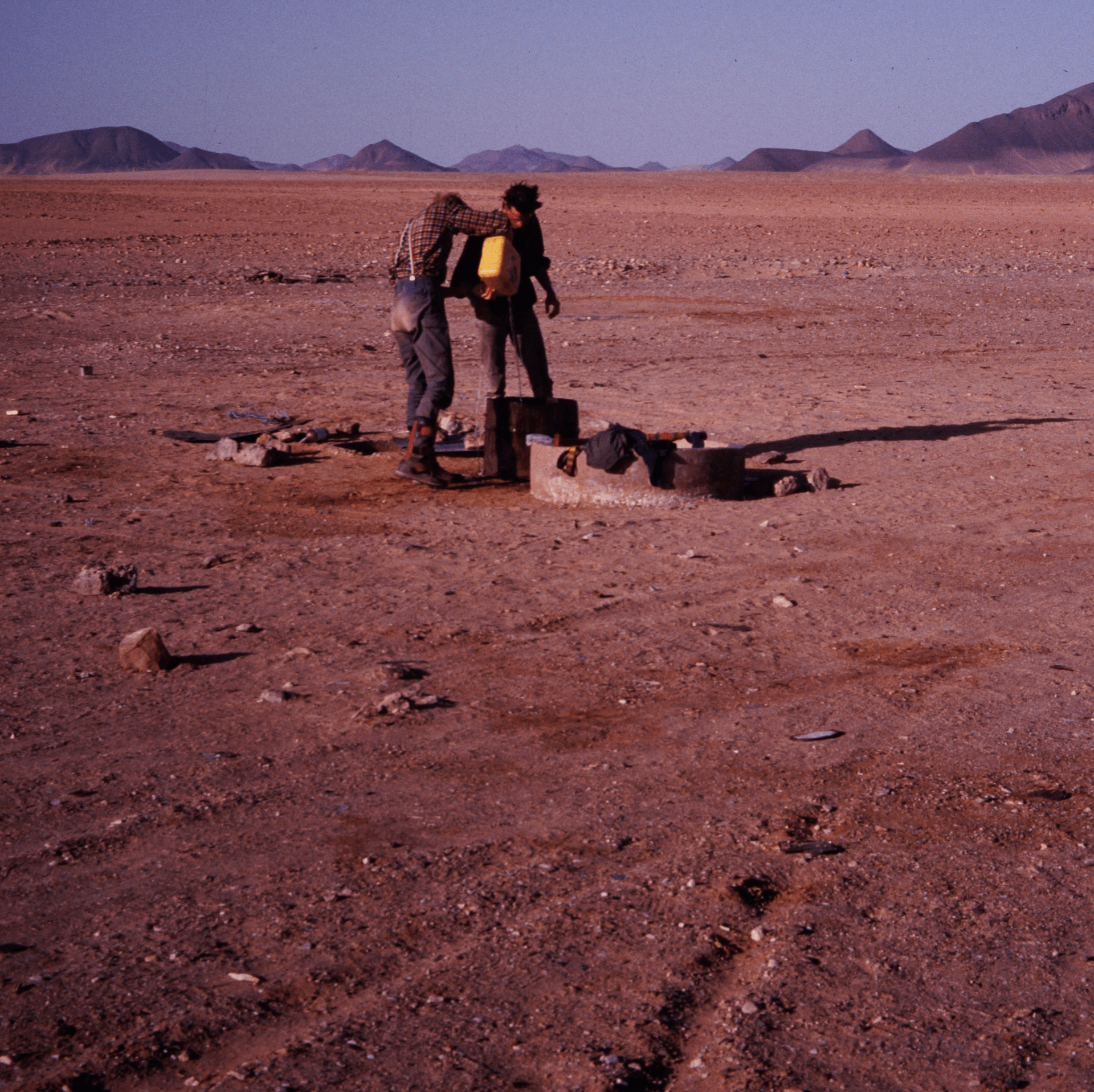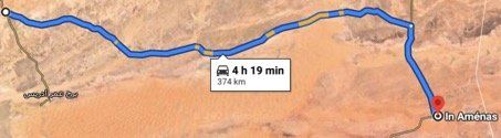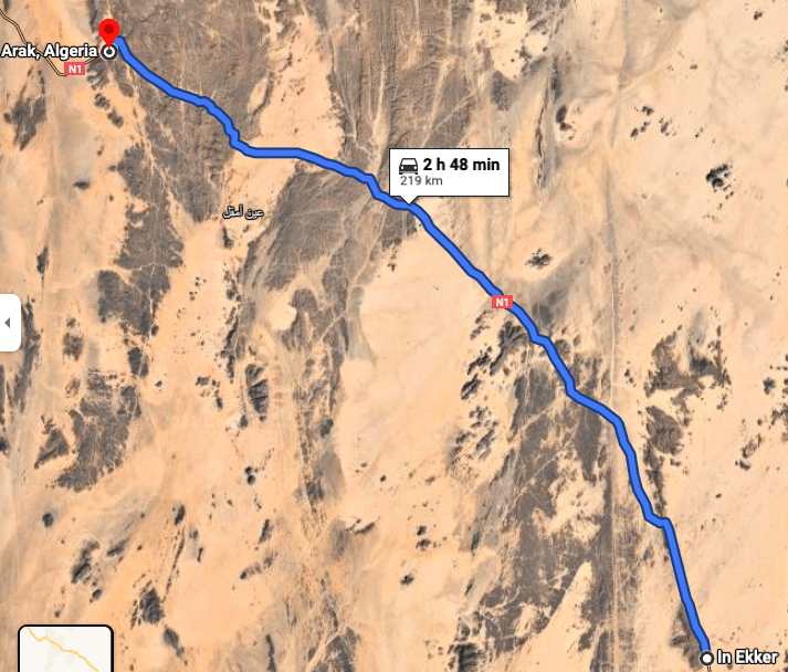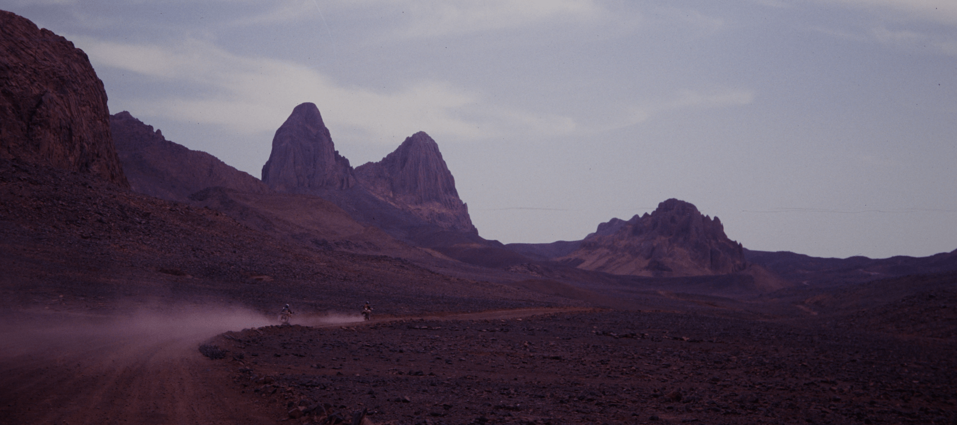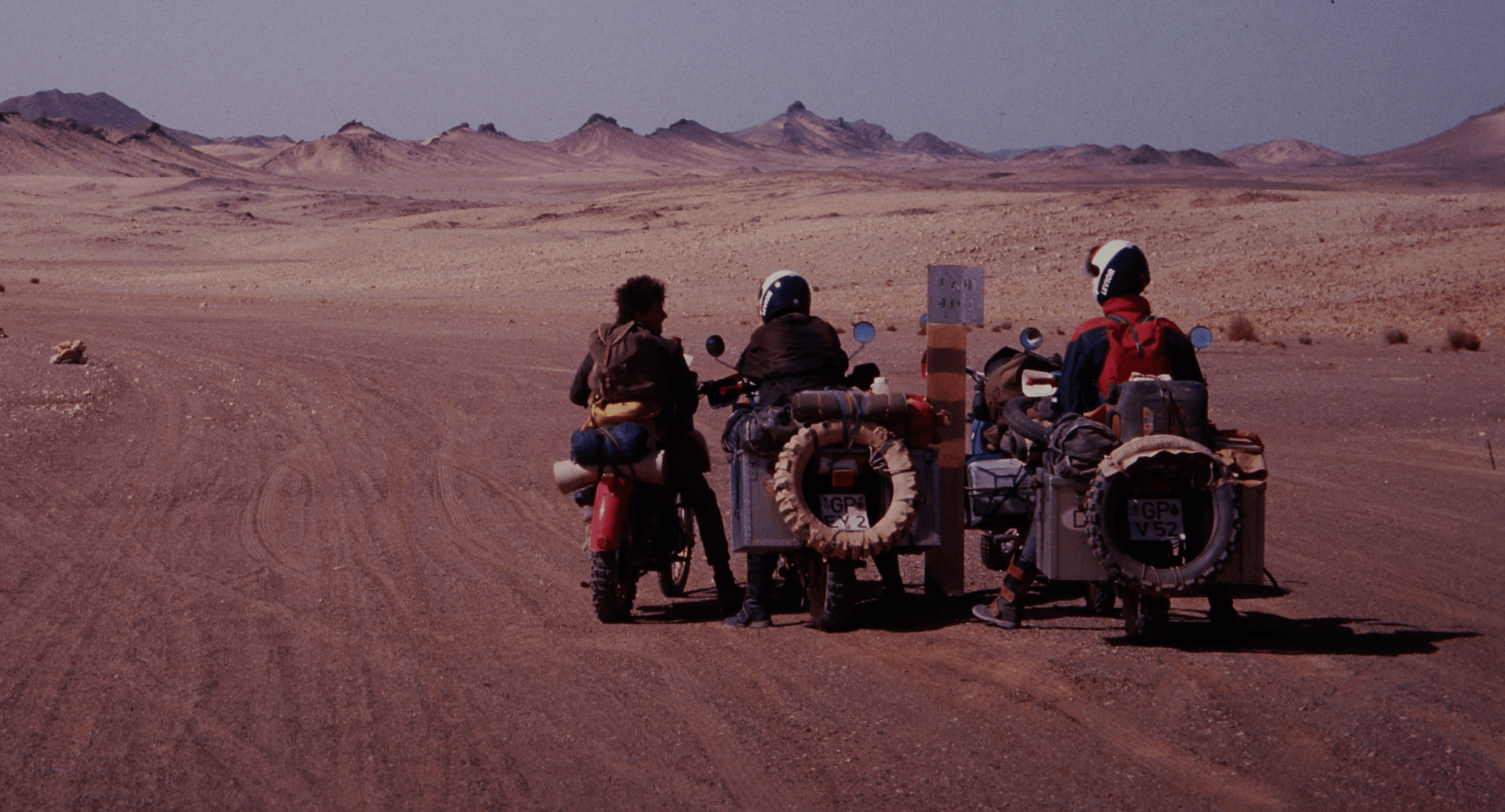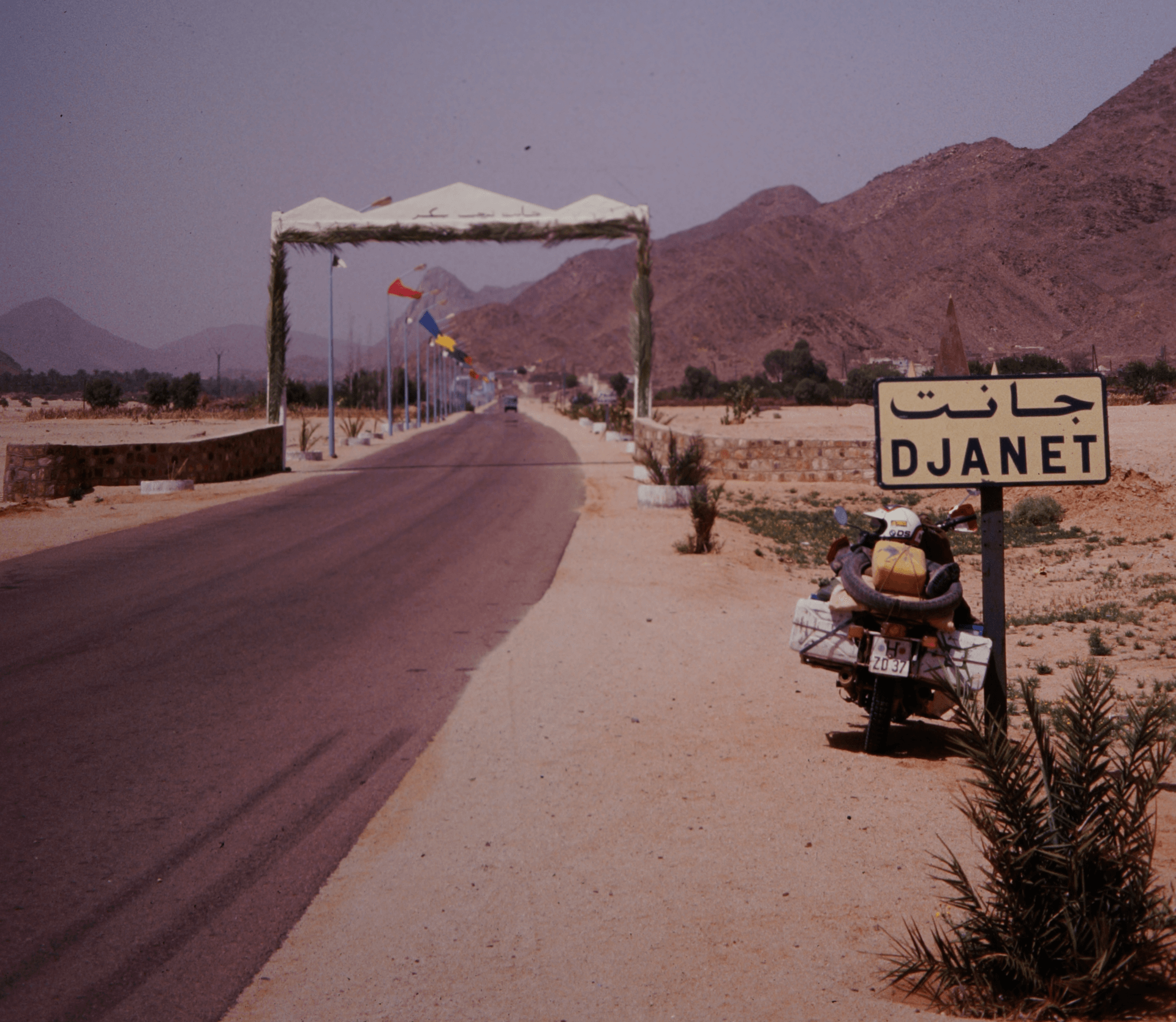 Wieder auf Asphalt passieren wir den Abzweig zu einer algerischen Öl-Förderanlage, dann erreichen wir In Ekker, eine kleine Siedlung, an deren Ortskern die frisch renovierte und stark befahrene N1 direkt vorbei führt. Wir halten an einem kleinen Restaurant, kaufen Zigaretten, trinken Minztee und essen kleine süße Küchlein. Bevor wir aufbrechen, kontrolliert Chrischi nochmals das Vorderrad der DR, es scheint alles in Ordnung zu sein. Auf dem Weg nach Norden wechseln sich gut ausgebaute Asphaltabschnitte und Umleitungen auf breiten Wellblechpisten ab. Auf einem asphaltierten Abschnitt steht am linken Straßenrand ein weißer Alfa Romeo 2000 ›Bertone‹. Wir stoppen und fragen, ob wir helfen können. Der Fahrer winkt ab. »Muss nur schnell den Achsschenkel wechseln. Ist schon das dritte Mal seit München, geht schnell.« Wir wundern uns über die sehr unterschiedlichen Fahrzeuge und Menschen, die auf der N1 nach Süden unterwegs sind und fahren weiter. Später sehen wir noch einen Citroën 2CV, an dem gerade ein Vorderrad gewechselt wird. Auch hier werden wir weiter gewunken.