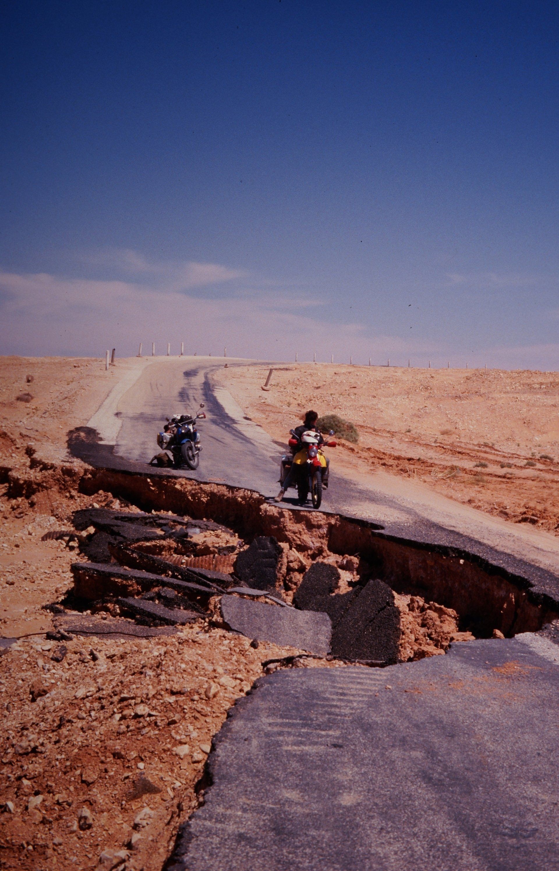 Wir sind früh wach und nach Kaffee und Zigarette packen wir auf, zahlen unsere Rechnung und sind unterwegs. Wir wollen die knapp 700 Aphalt-Kilometer nach In Salah in zwei Tagen gemütlich abreiten. Hinter dem Ortsausgang, am Abzweig zum Flugplatz von Tam steht einegrpße moderne Tankstelle. Wirtanken voll und lassen den 5-Liter-Kanister mit Altöl neben den Zapfsäulen stehen. Kurz hinter dem Abzweig, an dem wir Freitag auf den Asphalt eingebogen sind, führt eine Umleitung auf fester breiter Piste weg vom Asphalt. Nach zwanzig Kilometern sind wir wieder auf der frisch asphaltierten N1 – so frisch, dass der Asphalt noch schmierig und rutschig ist. Bei einer Zigarettenpause sehe ich, dass die ganze Front der BMW mit kleinen Asphalttröpfchen gesprenkelt ist, die das Vorderrad aufgewirbelt hat. Die Schutzbleche sind von innen mit einer dünnen Asphaltschicht bedeckt, was ein perfekter Rostschutz wären, bei Plastik-Schutzblechen aber nicht nötig ist. Während ich noch die Aphaltierung der BMW bestaune, höre ich Chrischi hinter mir fluchen. »Was’sen los? Irgend’was kaputt?« Zuerst denke ich, dass Chrischi sich über die Asphalttröpfchen ärgert, die mühsame Reinigungsarbeiten zur Folge haben werden, sehe dann aber, dass das Vorderrad der DR fast platt ist. Ich packe den kleinen Druckmesser und die Luftpumpe aus. 1,5 Bar sind auf Asphalt nicht akzeptabel. Wir pumpen den Reifen wieder auf 2,0 Bar auf. »Ist Dir vorher nix aufgefallen?« - »Heute morgen war’s noch gut.« Wir kontrollieren noch, ob das Ventil dicht ist, schrauben das Käppchen d‘rauf und fahren weiter. Kurz danach zwingt uns eine Umleitung erneut für zehn Kilometer auf eine gut gepflegte und markierte Piste. Wieder auf Asphalt macht Chrischi Zeichen, dass er stoppen will. Ich glaub‘ die Luft ist schon wieder raus.« Wir kontrollieren den Druck wieder und entscheiden, den Schlauch auszubauen und zu flicken. Während Chrischi das Loch im Schlauch sucht und einen Flicken aufklebt, kontrolliere ich sehr sorgfältig den Reifen, kann aber keinerlei Beschädigungen finden. Nach einer Stunde sind wir wieder unterwegs, die nächste Umgehung ignorieren wir und bleiben auf der fertiggestellten Trasse der N1, die nach wenigen Kilometern sogar schon wieder asphaltiert ist. Wir passieren einen Trupp Straßenarbeiter, die uns rufend und winkend vom frischen Asphalt vetreiben wollen. Wir winken nur zurück und fahren weiter. Inzwischen sind die Berge des Hoggar, die uns den ganzen Tag zur Rechten begleitet haben, nur noch als schwarze Schatten am Horizont rechts hinter uns zu sehen. Die N1 biegt nach rechts in das Tal eines Wadi ein und die Trasse ist so schlecht, dass wir einigen Spuren nach rechts auf eine parallel verlaufende Piste folgen. Wir versuchen die N1 links von uns nicht aus dem Blick zu verlieren, aber die Piste bringt uns von selbst zurück zur jetzt wieder asphaltierten Hauptstrecke.