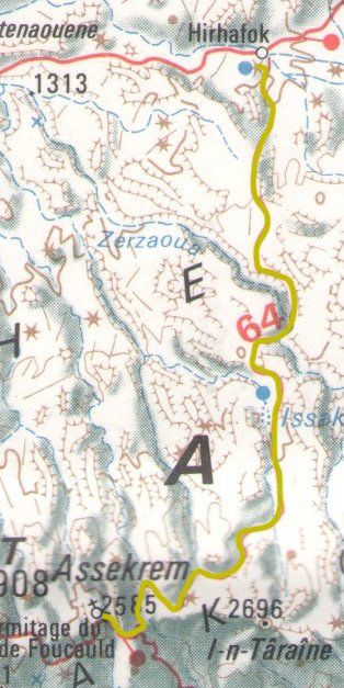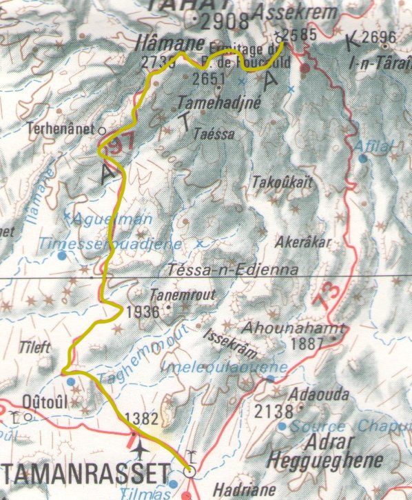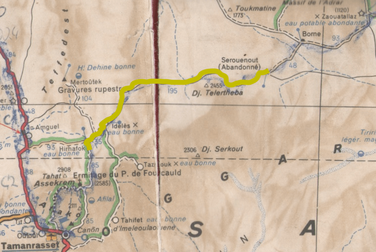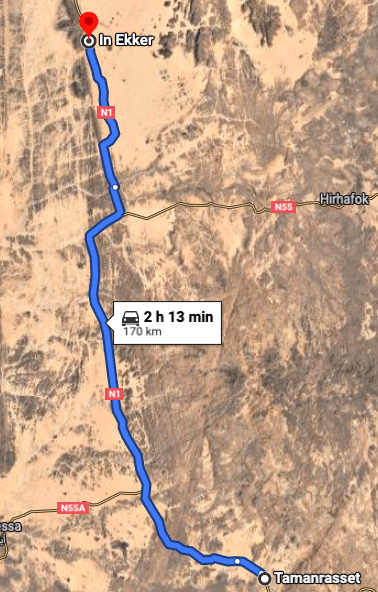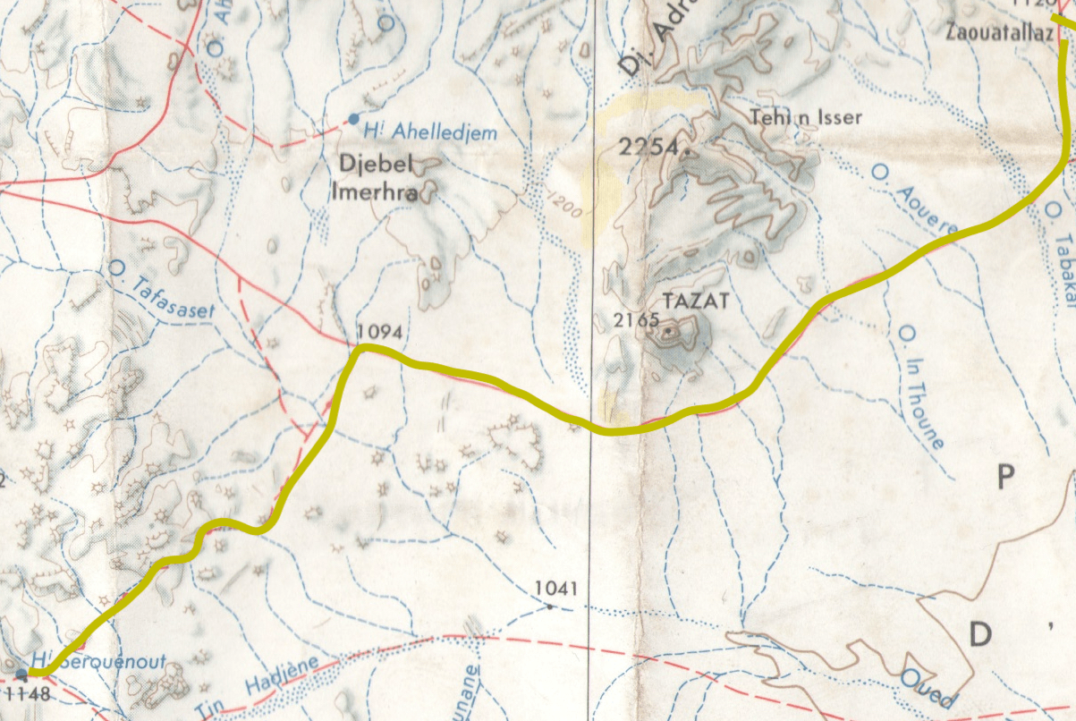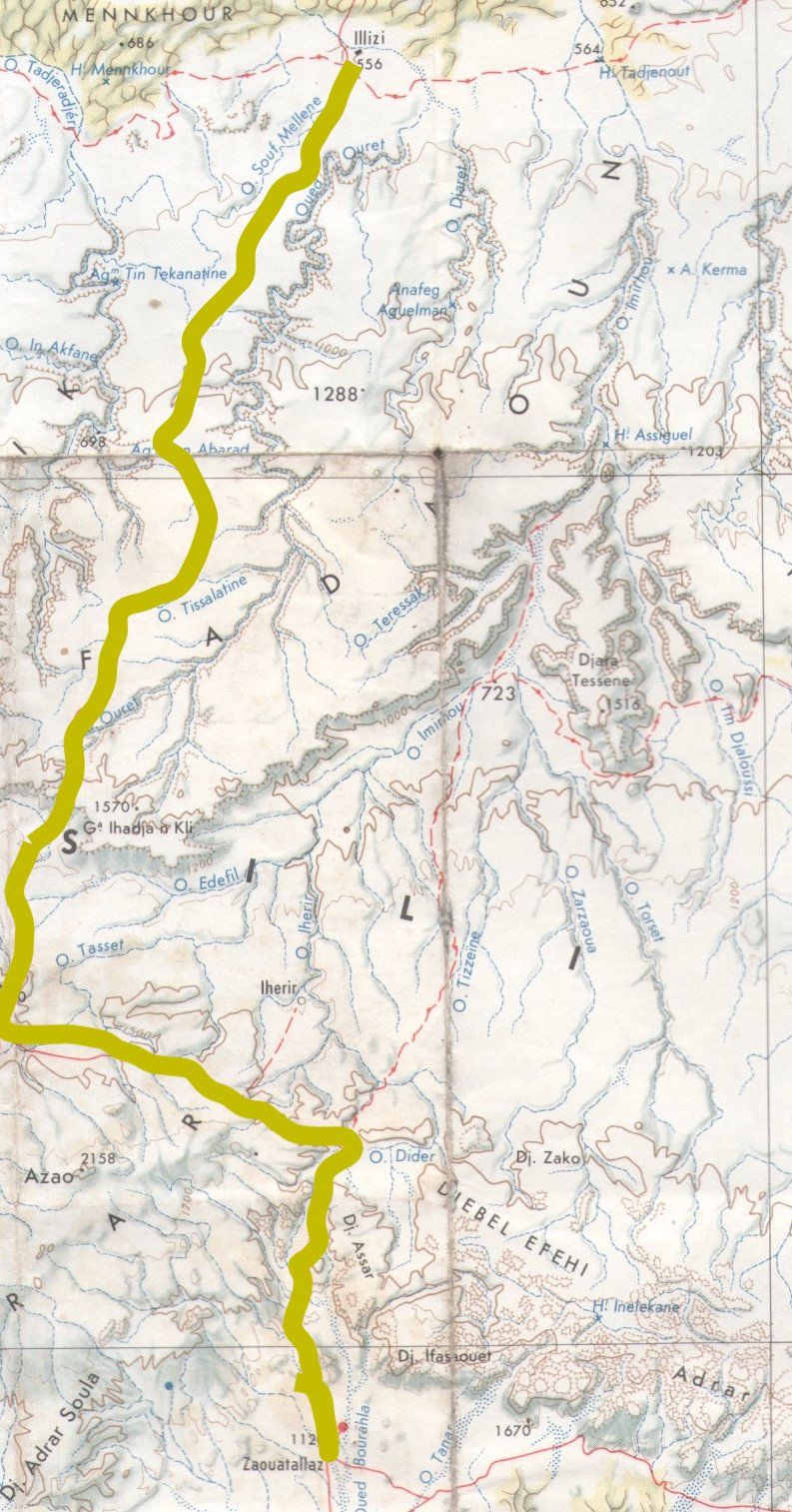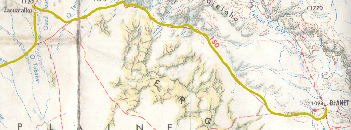 Morgens versuche ich mich mit Hilfe der IGN-Karte zu orientieren. Die Umleitungspiste sollte uns in wenigen Kilomtern zurück zur N1 bringen und kurz danach werden wir In Ekker passieren. Hier kam es Anfang der 60er Jahre, nach der formellen Unabhängigkeit Algeriens zu einem schweren Unfall bei einem der Atomtests der französischen Ex-Kolonialmacht. Die Explosion erfolgte nicht wie geplant unterirdisch, sondern bahnte sich ihren Weg durch den Zugangsstollen an die Oberfläche. Hunderte Tonnen geschmolzenes strahlendes Gestein und radioaktives Gas verseuchten die Umgebung, einige tausend französische Militär- und Regierungsbeobachter und zufällig anwesende Einheimische wurden verstrahlt.