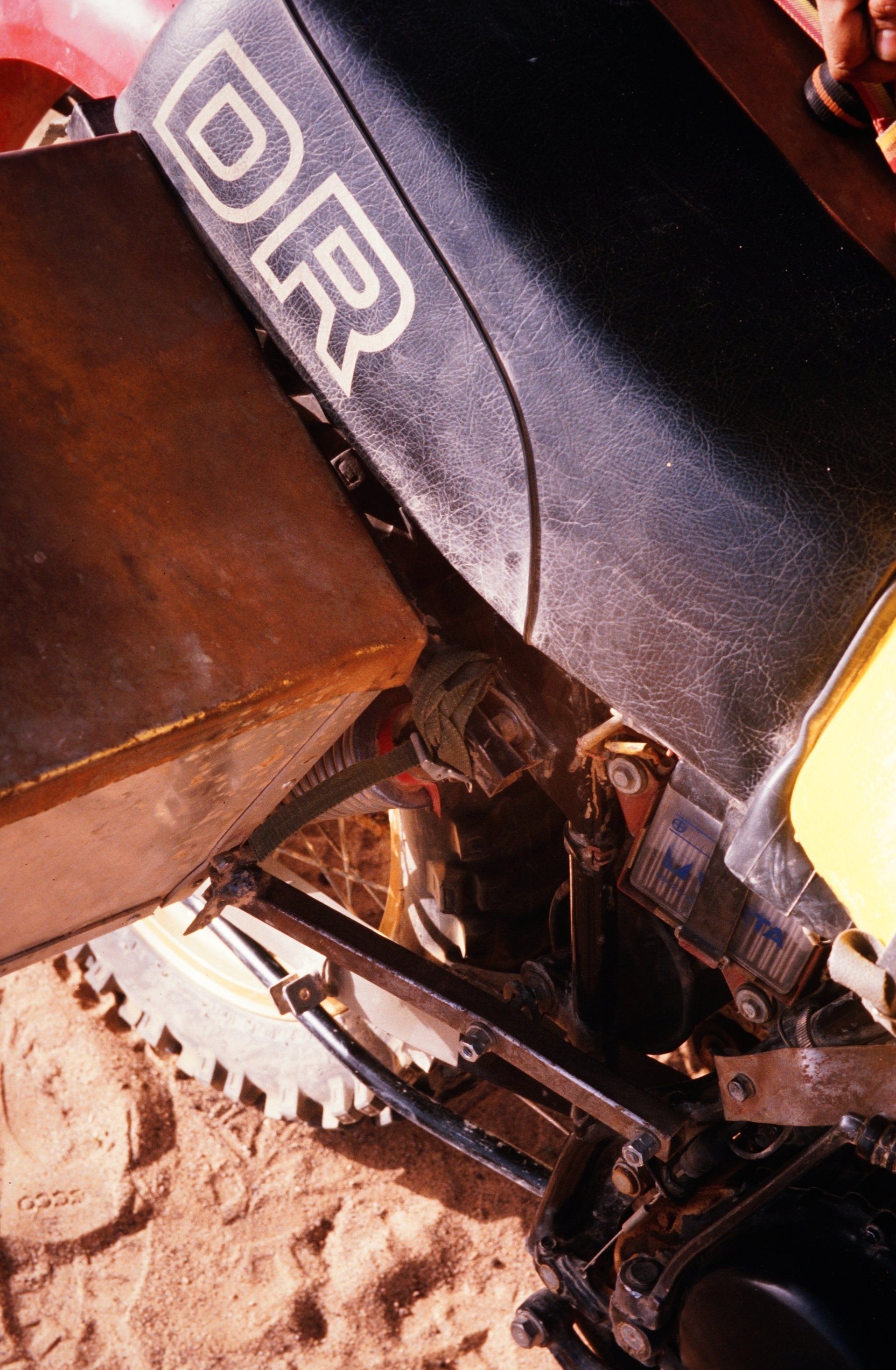 Er klebt eine weitere Lage GFK auf die immer noch nässenden Ecken des Tanks und flucht über die beinahe unerreichbaren Schrauben zum Einstellen der Ventile. Außerdem bekommt die DR neues Öl und eine Reinigung des Luftfilters und der Kette spendiert. Ich drehe eine Runde um die BMW, kontrolliere die Speichen und drehe alle erreichbaren Schrauben eine Viertelumdrehung los und dann eine halbe wieder fest. Am Kofferträger sind fast alle Schrauben schon ein bisschen lose. Mittags kommen die Arbeiter der Palmenplantage bei ihrem Feierabend an unserem Lager vorbei. Ein junger Mann spricht uns auf Französisch an. Er plaudert ein bisschen mit Chrischi, hinterher sind wir für heute Abend zum Plamweintrinken in der Plantage eingeladen. Vorher fahren wir aber noch mal nach Tozeur. Heute steht eine Gruppe Ralleymotorräder vor unserem neuen Stamm-Café. Mehrere XTs und XLs und eine Cagiva Elefant, alle in offiziellem Wettbewerbskostüm, wie wir es aus dem Fernsehen von der berühmten Rallye Paris-Dakar kennen. Eine BMW ist nicht dabei, obwohl BMW den Sieg in der Motorradklasse Mitte der 1980er Jahre für sich gepachtet zu haben schien. In den letzten Jahren hatte Honda allerdings den technischen Vorsprung von BMW aufholen und die Paris-Dakar dreimal in Folge gewinnen können.