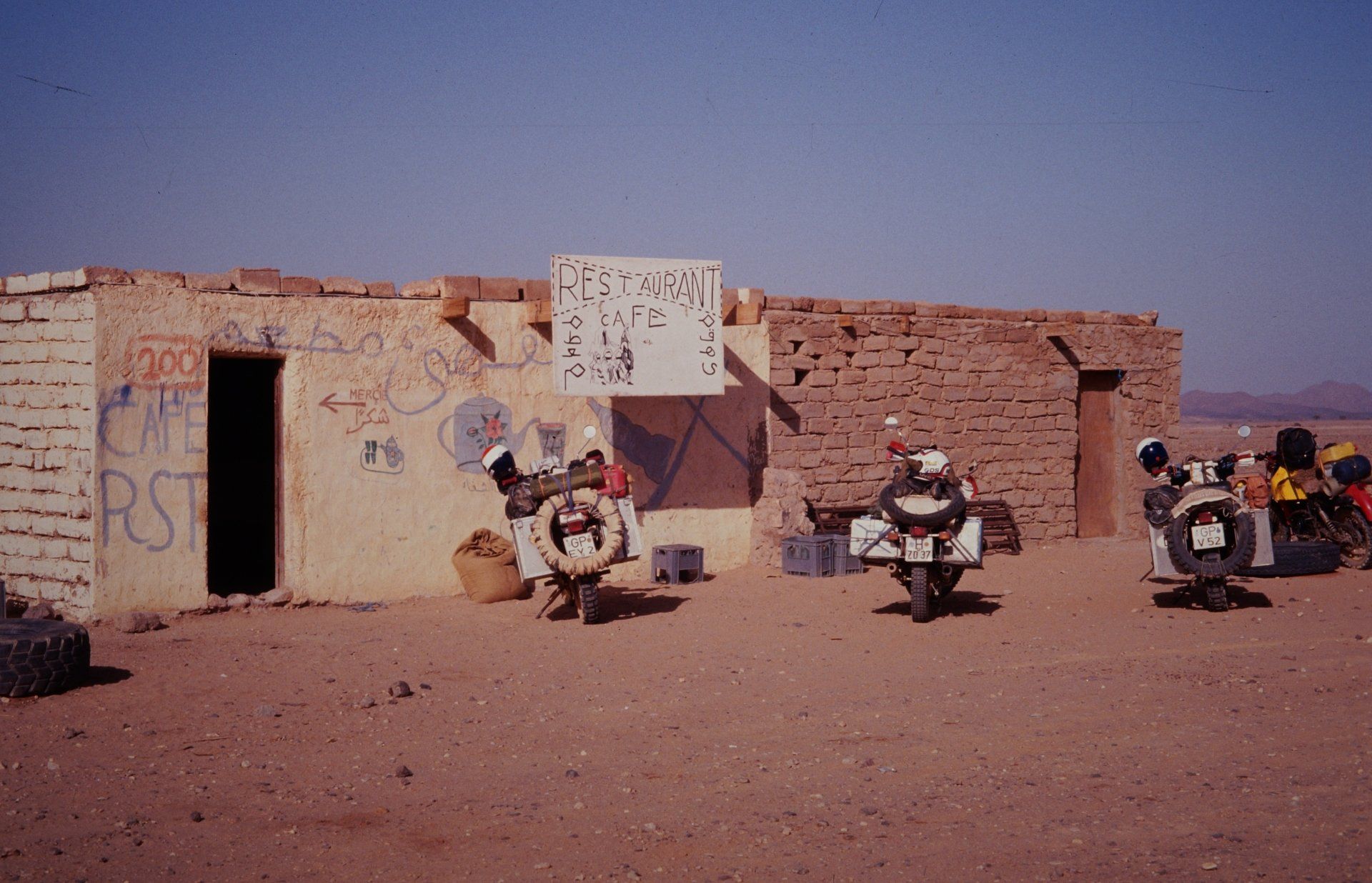 Wir setzen uns zu unseren neuen Freunden auf die Terrasse und natürlich sind die Rallyemotorräder das Topthema, jemand erzählt, eine japanische Firma drehe einen Spielfilm über die Rallye. Als ich mir gerade ein Sandwich und ein Bier zum Mittsagessen bestellt habe, kommt eine junge Frau auf die Terrasse und fragt alle, wer Interesse habe, als Komparse an einem Film mitzuwirken. Fast alle sagen zu, auch Chrischi und ich. Unser Hauptinteresse ist es natürlich, vielleicht ein paar Meter auf den Wettbewerbsmaschinen fahren zu können, die in der Ausstattung, wie sie vor uns stehen, ein paar zehntausend Mark Wert für uns also in völlig unereichbarer Ferne sind. Wir unterschreiben ein kleines Formular zum Haftungsausschluss, bekommen freie Verpflegung und ein kleines Taschengeld von 100 französischen Franc pro Drehtag zugesagt und sollen morgen um 17 Uhr pünktlich hier am Café auf die Crew warten. Nachdem alle Formulare eingesammelt sind, verlässt das Produtktionsteam mit den Motorrädern Tozeur Richtung Westen, wo auf halbem Weg zur algerischen Grenze die kleine Oase Nefta liegt.