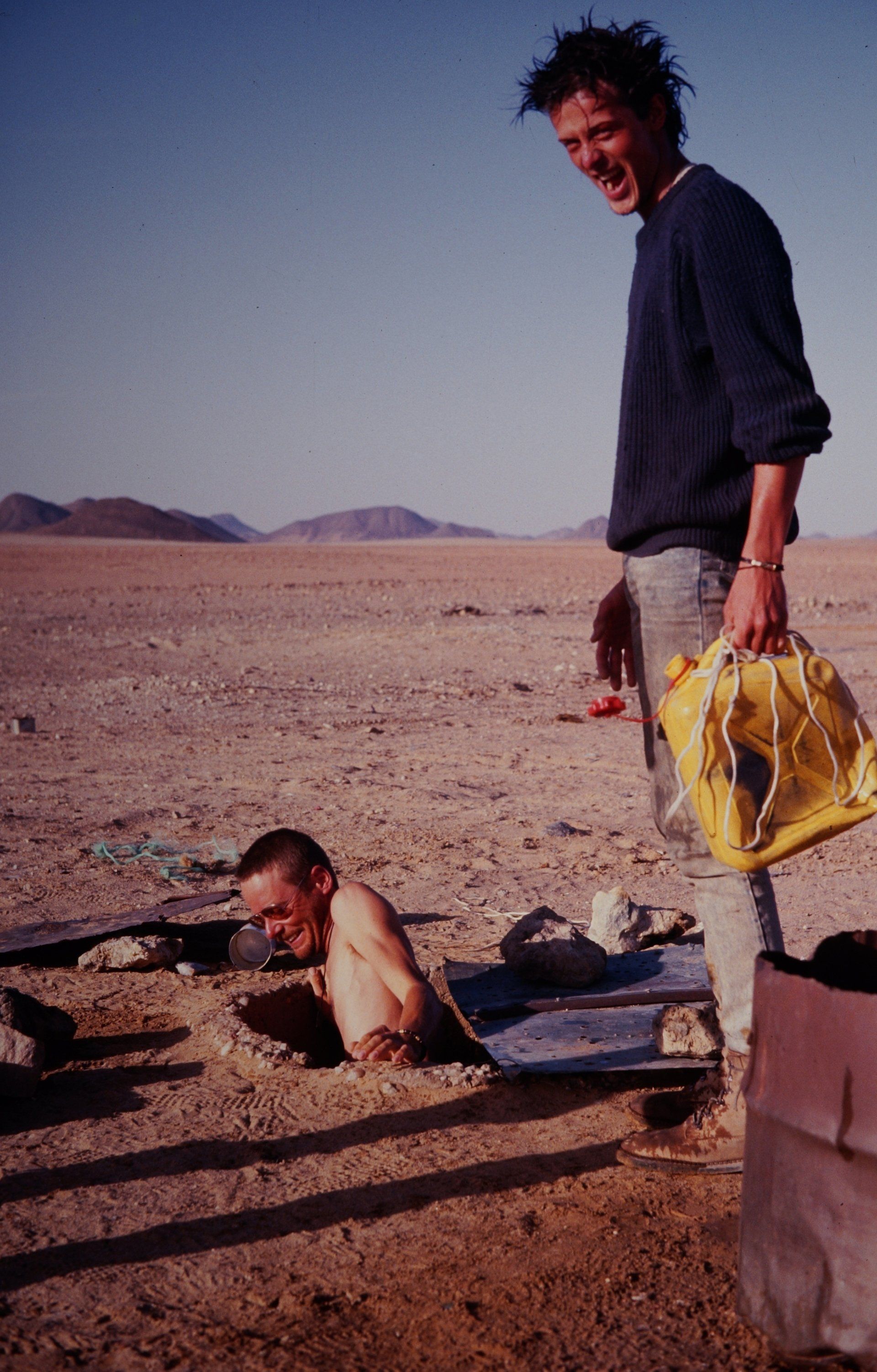 Wie Geräusche in der Stille lauter wirken, erscheinen Entfernungen im Nirgenwo kürzer als sie wirklich sind. Wieder am Zelt erzählt Chrischi, dass er auf dem Dünenhang Spuren eines nächtlichen Kampfes zwischen einem großen Käfer und etwas, das vielleicht ein Skorpion war, gesehen und photographiert hat.
