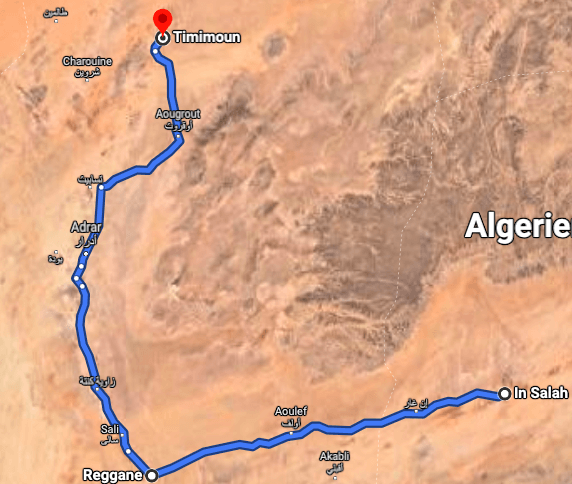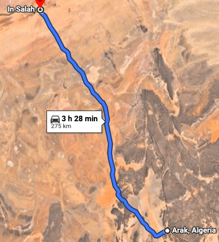 Nach einem schnellen Frühstück im Campingplatz-Restaurant mit Milchkaffee, der nicht nach Couscous schmeckt, machen wir uns zu unserer letzten Pistenetappe auf. Wir verlassen In Salah auf Asphalt Richtung Westen. Beim kleinen Vorort El Barka hört der Asphalt auf und die planierte Piste führt uns nördlich an dem Dörfchen vorbei. Die Piste ist mit weißen Stangen, die gerade noch in Sichtweite zueinander stehen, markiert. Wir passieren eine Gabelung der Piste und halten uns auf der nördlichen Variante, die dem Bergrücken im Norden folgt und größtenteils gut zu befahren ist. Nur an einer Steigung auf ein kleines Plateau gibt es ein paar hundert Meter tiefen Sand, den wir aber problemlos bewältigen. Kurz nach der Steigung geht es schon wieder hinab in eine weite Ebene, wieder liegt nördlich ein Bergrücken.