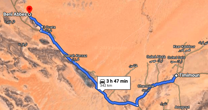 Wir sind alle um neun Uhr auf den Beinen, packen auf und trinken Kaffee mit Milch auf der Terrasse des Restaurants. Mittags sind Chrischi und ich wieder auf der Fernstraße nach Norden. Unser heutiges Etappenziel ist nur rund 350 Asphalt-Kilometer entfernt in Beni Abbès, wo wir am späten Nachmittag ankommen. Wir finden eine kleine überfüllte, laute Bar, wo wir Abendessen wollen, stellen aber fest, dass wir kein algerisches Geld mehr haben und die Banken schon geschlossen sind. Ich finde noch einen schweizerischen 10-Franken-Schein in meiner Brieftasche, der uns ein Abendessen in der Bar ermöglicht. Wir übernachten etwas außerhalb des Ortes in den Dünen.