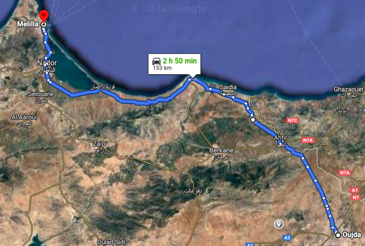 Wir sind nach einem schnellen Kaffee früh wieder unterwegs, obwohl unsere heutige Etappe nur rd. 150 km lang sein wird. Wir fahren zurück zur Fernstraße nach Westen und sind nach wenigen Minuten am Abfertigungsposten des algerischen Militärs und Zolls. Unsere Dokumente werden geprüft und schließlich fragt sogar einer der Uniformierten nach unserer Devisen-Umtauschbestätigung, die wir uns in In Aménas haben ausstellen lassen. Dass die Umtauschbestätigung ein anderes Datum als der Einreisestempel hat, stört niemanden. Nach nur zwanzig Minuten werden wir über die mit einem weißen Strich markierte Grenze geschickt. Die Marokkaner lassen sich etwas mehr Zeit und wollen sogar in die Tankrucksäcke gucken, aber nach einer Dreiviertel Stunde sind auch hier alle Stempel gesetzt und wir werden weiter gewunken. Direkt hinter dem Posten steht am Straßenrand ein kleiner Kiosk, der Coca-Cola und Orangen verkauft – wir sind zurück im Kapitalismus! Wir haben seit Wochen kein frisches Obst mehr gesehen, geschweige denn gegessen. Chrischi kauft vier Orangen und zwei kleine Flaschen Cola. Wir stoßen mit der Cola an, die Orangen heben wir uns für später auf. Hinter Oujda steigt die Straße auf den Hauptkamm des Atlas auf und führt von dort in weichen Kurven und mit herrlicher Aussicht hinunter in die Küstenebene. Die Halbinsel von Melilla ist schon von weitem hinter ausgedehnten Salinen zu sehen. Eine Stunde später stehen wir erneut vor Grenzabfertigungsanlagen und verlassen Marokko schon wieder. Die spanische Guardia Civil beachtet uns als offensichtliche Europäer kaum, widmet sich dafür ausführlich den kleinen überladenen Peugeots und Renaults mit marokkanischen, spanischen und belgischen Kennzeichen, die die afrikanischen Gastarbeiter zurück zu ihren europäischen Areitsplätzen bringen. Ein Stück vor uns ist der gesamte Inhalt eines kleinen Seat neben dem Auto ausgebreitet und wird von einem Grenzer mit Schäferhund untersucht.