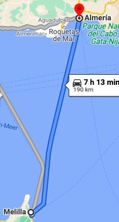 Es ist Mitte April, und hier bedeutet das, es ist ein angenehm warmer Frühlingstag. Und da wir inzwischen wieder einige Tausend Kilometer weiter nördlich sind, wird es auch nicht mehr pünktlich um 18 Uhr dunkel. Wir verbringen den Nachmittag in der mittelalterlichen Festungsstadt Melilla. Gegen fünf fahren wir zum Hafen, kaufen uns zwei Deckspassagen nach Almería auf dem europäischen Festland und reihen uns in die Schlange vor dem Fähranleger ein. Um acht geht die Schiffsreise nach Spanien los. Wir essen in einem Restaurant auf dem Oberdeck zu Abend und suchen uns hinterher einen windgeschützten Schlafplatz auf dem Aussichtsdeck in der Nähe der Rettungsboote. Die Fahrt über die Alboran See ins 200 km entfernte Almería dauert acht Stunden, so dass wir am frühen Morgen in Europa ankommen werden. Wie immer bauen wir eine kleine Festung aus unseren Sachen rund um den Schlafplatz. Meine Motorradjacke und der Rucksack dienen als Kopfkissen, der Helm liegt rechts neben meinem Kopf. Das sanfte Schaukeln des Mittelmeeres und das gleichmäßige Brummen der Schiffsmotoren, das durch das Stahldeck übertragen wird, lässt uns schnell einschlafen.