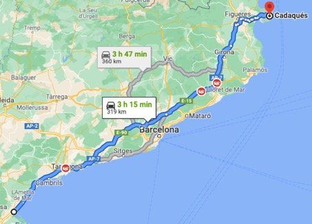 Wir frühstücken in dem Campingplatz-Restaurant und packen auf. Als wir abfahrbereit sind, zieht es sich zu – heute tatsächlich. Von Westen drängen dunkle tiefliegende Wolken gegen die Küste. »Es wird Regen geben.« - »Mach kein’n Scheiß! Wir sind in Spanien.« Etwas verunsichert wegen des Wetters fahren wir los, folgen der Küste nach Nordwesten. Zwei Stunden später sind wir in den Vororten von Barcelona und müssen wieder unseren Weg nach Norden finden und dabei die Autobahn vermeiden. Immerhin scheint jetzt mal die Sonne. Hinter Barcelona tanken wir die Motorräder voll und biegen ins Landesinnere ab, um die nieder-ampurische Küstenlinie der Costa Brava abzuschneiden. Es geht in dichten Wäldern hinauf in die Berge von Hoch-Ampurien, während ich den Benzinverbrauch seit Almería berechne, wenn ich keinen Rechenfehler gemacht habe: gut 8 Liter pro 100 km. Dass ist wesentlich mehr als erwartet, aber es ist auch die erste europäische Landstraßenetappe seit dem Motorumbau, vielleicht sind 8 Liter der neue Normalverbrauch. Kurz vor Girona bricht ein heftiges Gewitter über uns herein. Nach fünf Minuten sind wir beide völlig durchnässt. Für die nur noch knapp 100 km bis Cadaques bruchen wir doch fast zwei Stunden. Nasser Asphalt verunsichert uns inzwischen mehr als feste Sand- oder Schotterpisten.