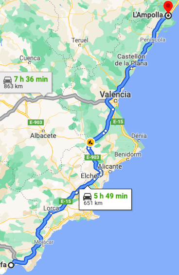 Das Aufwachen bei Sonnenaufgang und das sehr schnelle Frühstück am Morgen, haben wir schon wieder verlernt, so dass wir den Campingplatz erst gegen zehn verlassen. Wir durchqueren Almería, hinter der Stadt passieren wir ein paar in den 60er und 70er Jahren für Filmproduktionen gebauten Westernstädtchen und begeben uns auf die E15, die von der Südspitze Spaniens quer durch Frankreich bis in den Norden Schottlands führt, und der wir bis Zentralfrankreich folgen werden. Da wir die mautpflichtigen Autobahnen in Spanien meiden wollen, fahren wir hauptsächlich auf kleinen und größeren Landstraßen, nach einem Schlenker ins Landesinnere, die Mittelmeerküste hinauf. In Valencia verfahren wir uns im Bemühen, die Richtung nach Barcelona zu finden, ohne den blauen Autobahnschildern zu folgen. Hinter Valencia führt die gut ausgebaute Landstraße die Küstenlinie entlang. Gegen Abend schneidet die Fernstraße die Landzunge des Ebrodeltas ab, zurück an der Küste, im Städtchen L’Ampolla sehen wir das Hinweisschild zu einem Campingplatz mit Restaurant. Wir stoppen kurz und beschließen hier zu übernachten.
