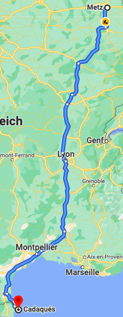 Etwas benommen vom Rotwein wachen wir am nächsten Vormittag auf. Ich starte den Benzinkocher und mache Kaffee während Chrischi im kleinen Campingplatzladen ein Baguette und ein paar kleine Törtchen kauft. Wir frühstücken im Schatten vor unserem Zelt und trinken Kaffee mit richtiger Milch. Chrischi scheint ein bisschen nervös zu sein und geht nach dem Frühstück nochmals zur Rezeption, weil er seine Ma ein weiteres Mal anrufen will. Ich breite inzwischen die Spanien- und Frankreichkarten vor mir aus und plane unseren Weg nach Hause. Ich will auf jeden Fall einen Zwischenstopp in Cadaqués in Katalonien einlegen. Durch Spanien werden wir Landstraßen fahren und in Frankreich dann die zwar mautpflichtge aber deutlich schnellere Autobahn nehmen. Der übliche Weg führt über Montpellier, Avignon und Lyon nach Mulhouse, südlich von Freiburg überquert man dann die französisch-deutsche Grenze und fährt auf A5 und A7 über Karlsruhe und Frankfurt nach Hannover. Beim Blick auf die Karte fällt mir ein, dass unsere Motorräder vielleicht immer noch auf der ›Fahndungsliste‹ der deutschen Autobahnpolizei stehen und 600 km auf deutschen Autobahnen wahrscheinlich keine gute Idee sind. Ich überlege kurz und denke, die beste Möglichkeit wäre vermutlich, wenn wir uns an der deutschen Grenze von jemandem abholen lassen würden. Wenn wir in Cadaqués sind, werde ich Heiko anrufen und fragen, ob er sich ein passendes Auto leihen kann und Zeit hat, uns an der luxemburgischen oder belgischen Grenze abzuholen. Im Zweifel könnte ich auch meine Eltern bitten, uns einzusammeln.